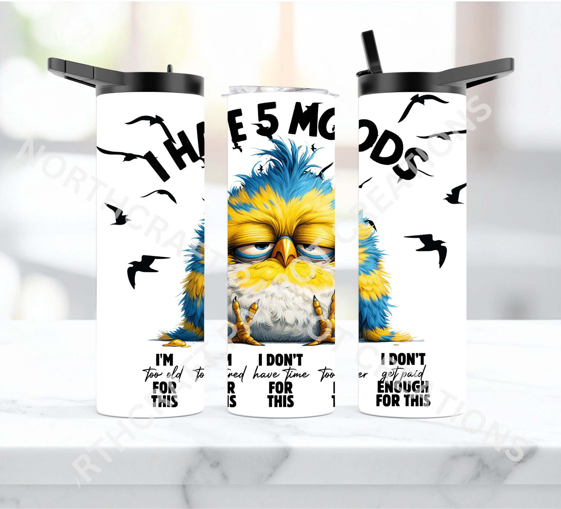 This 20oz or 30oz tumbler perfectly captures the mood of every exhausted parrot lover. Featuring a tired, worn-out parrot alongside the witty phrase “I have 5 moods: I'm too old for this, I'm too tired for this, I don't have time for this, I'm too sober for this, I don't get paid enough for this,” it’s a hilarious reminder to keep going with a smile. Durable and spacious, it keeps your drink just right while adding a playful touch to your daily routine. Perfect for anyone who’s had enough.