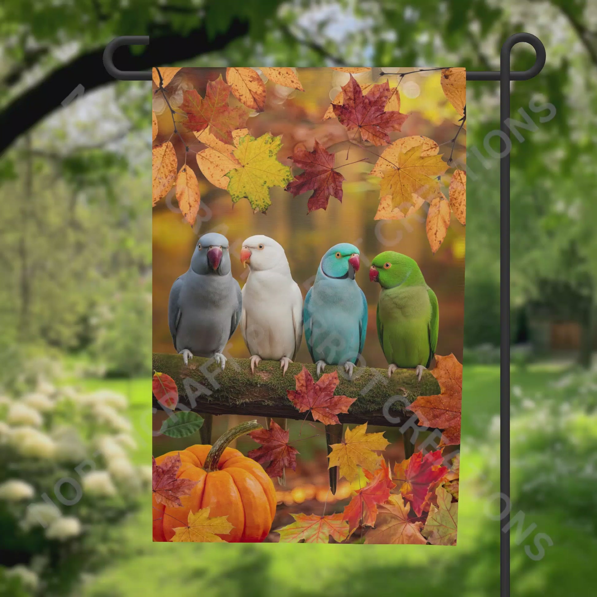 Indian Ringneck Flock Leaves and Pumpkin Garden Flag