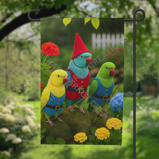 Three vibrant Indian Ringnecks—yellow, blue, and green—stand ready as the garden's most colorful gnome guardians! One dapper fellow sports a classic gnome hat while the trio keeps watch over their fishing rods. These clever parrots bring personality and protection to your garden in the most delightfully quirky way. This charming garden flag celebrates the playful spirit of these intelligent birds while adding a splash of tropical color and whimsy to your outdoor sanctuary.