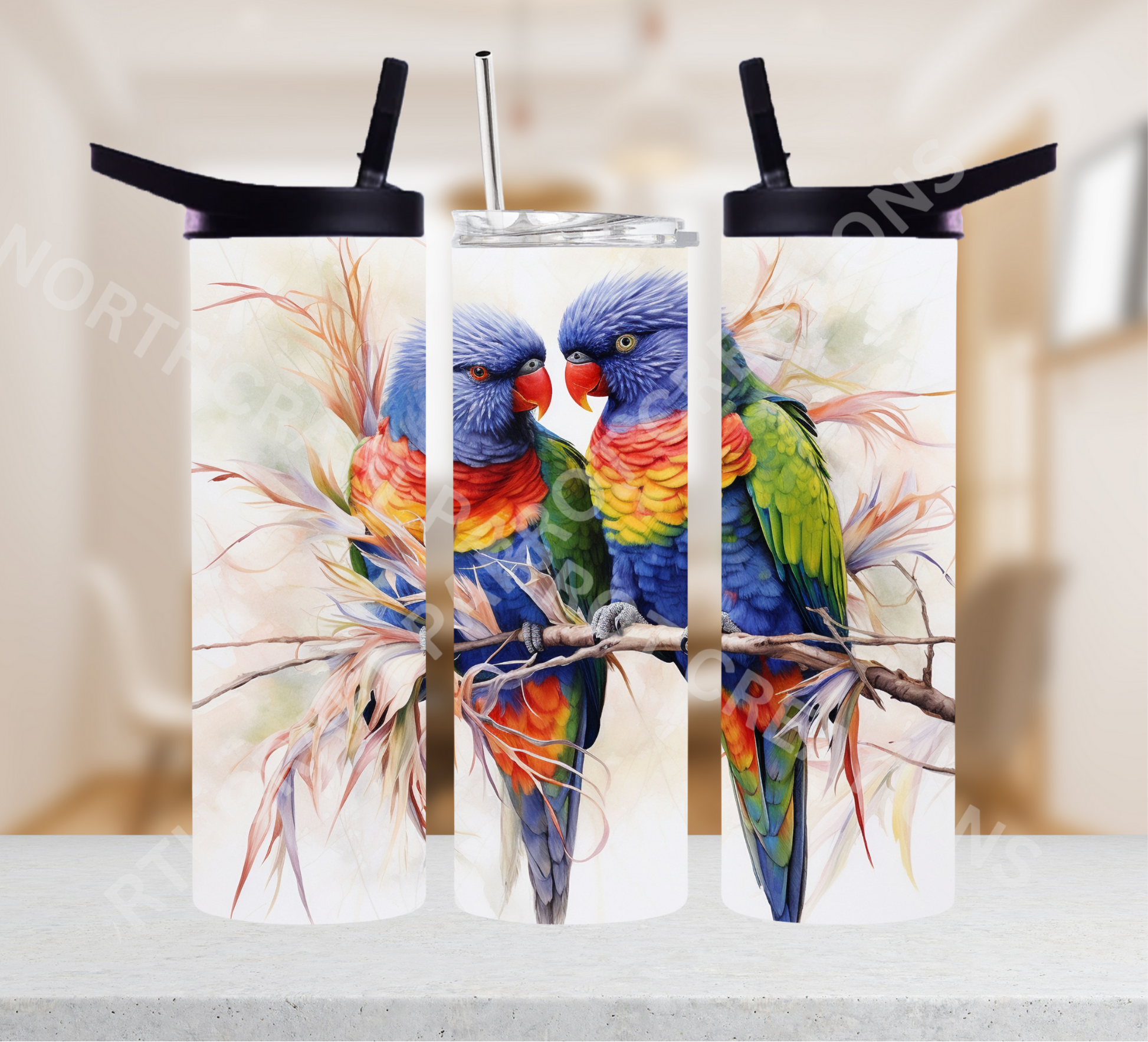 Enjoy the vibrant charm of this tumbler featuring a pair of colorful Lorikeets perched gracefully on a branch against a soft watercolor backdrop. Available in 20oz or 30oz sizes, it combines artistic beauty with practical use, keeping your drinks at the perfect temperature while brightening your day with nature’s lively palette. Ideal for bird lovers and art enthusiasts alike, this tumbler transforms everyday hydration into a moment of creative inspiration.