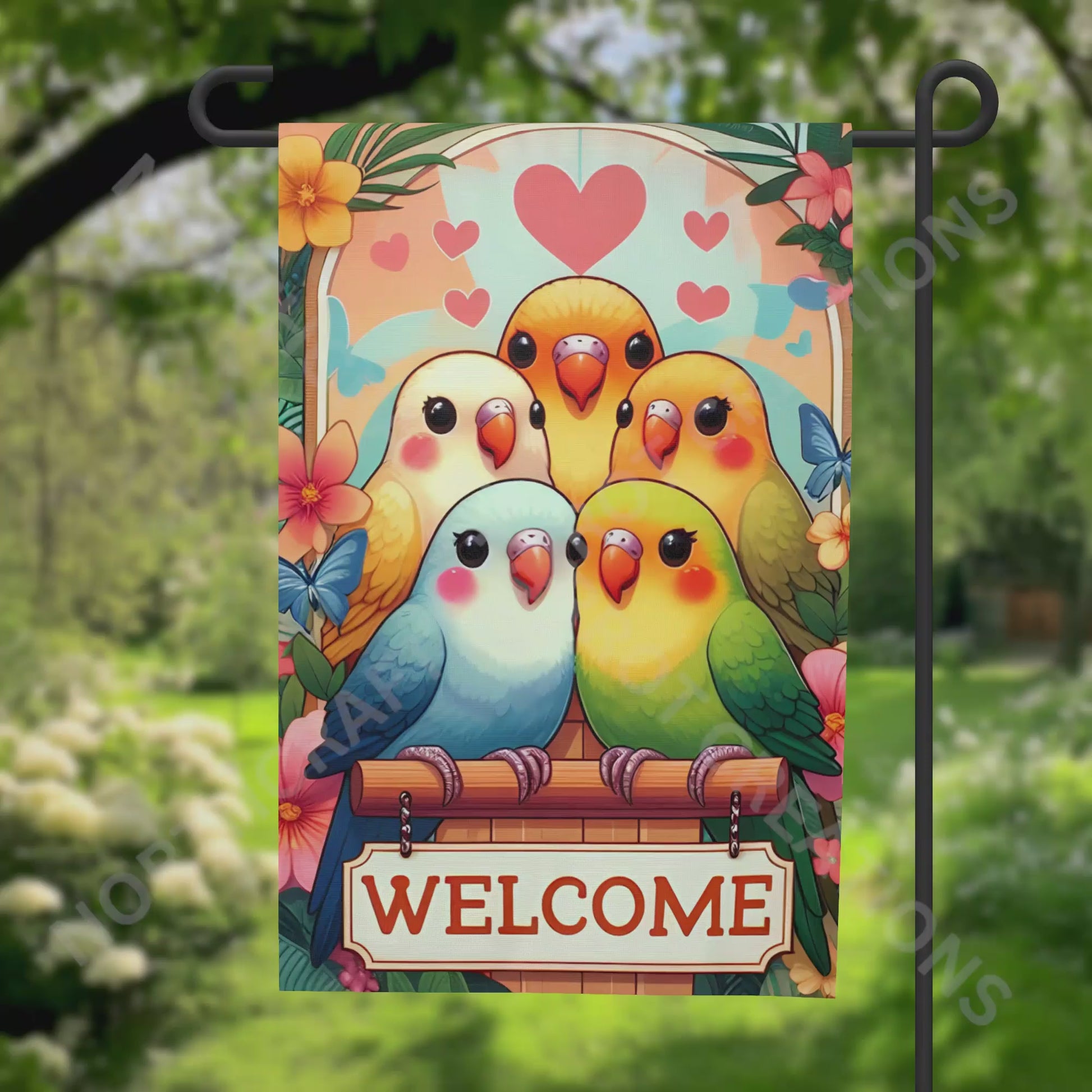 Lovebirds "Welcome" Cartoon Style Garden Flag