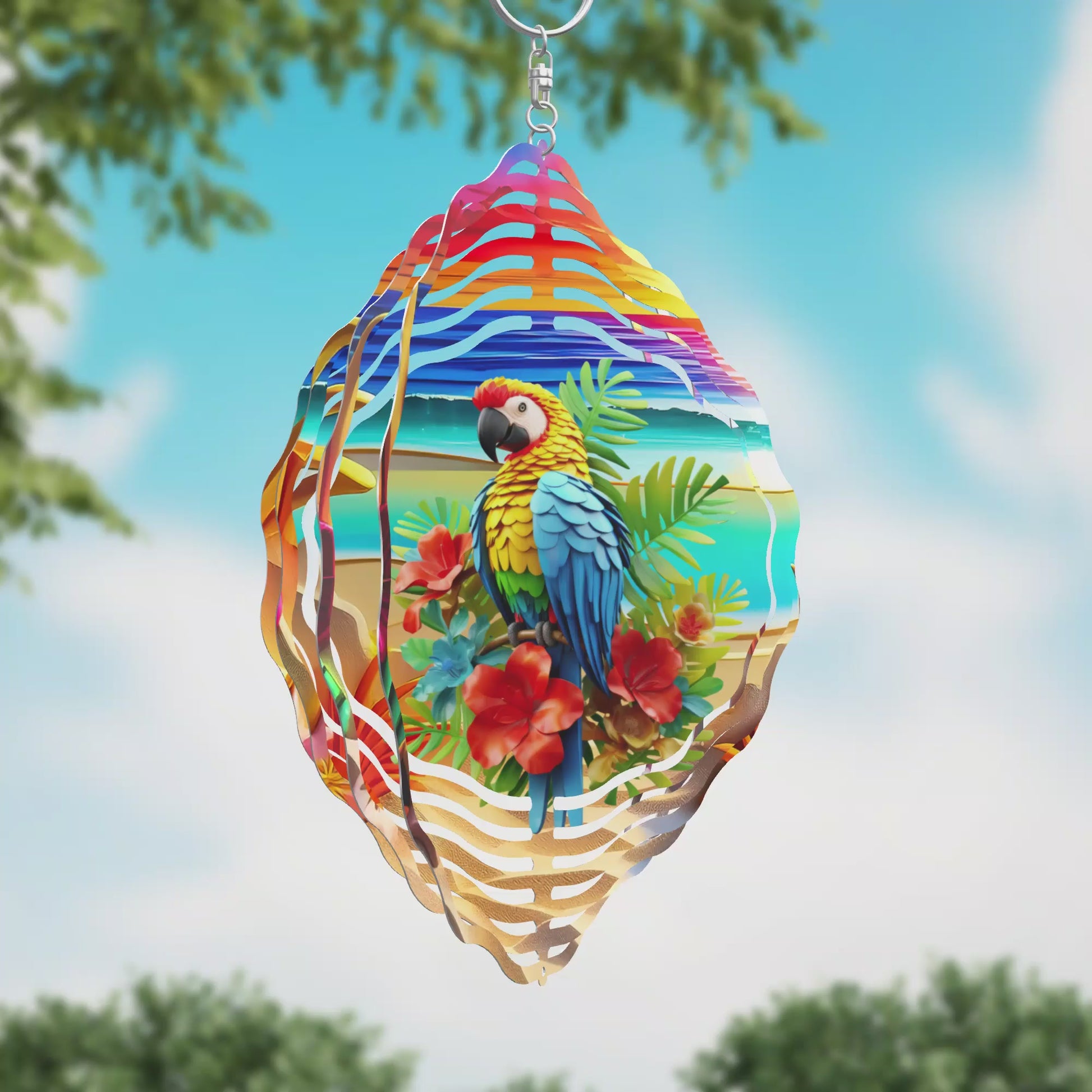 This macaw wind spinner showcases a proudly perched macaw surrounded by vibrant flowers on a peaceful beach scene. Available in 8" or 10" sizes, it spins gracefully in the breeze, adding soothing motion and tropical beauty to your outdoor space. This spinner brings a gentle, uplifting energy to gardens and patios, perfect for those who appreciate nature's charm and want to create a calming, supportive atmosphere.
