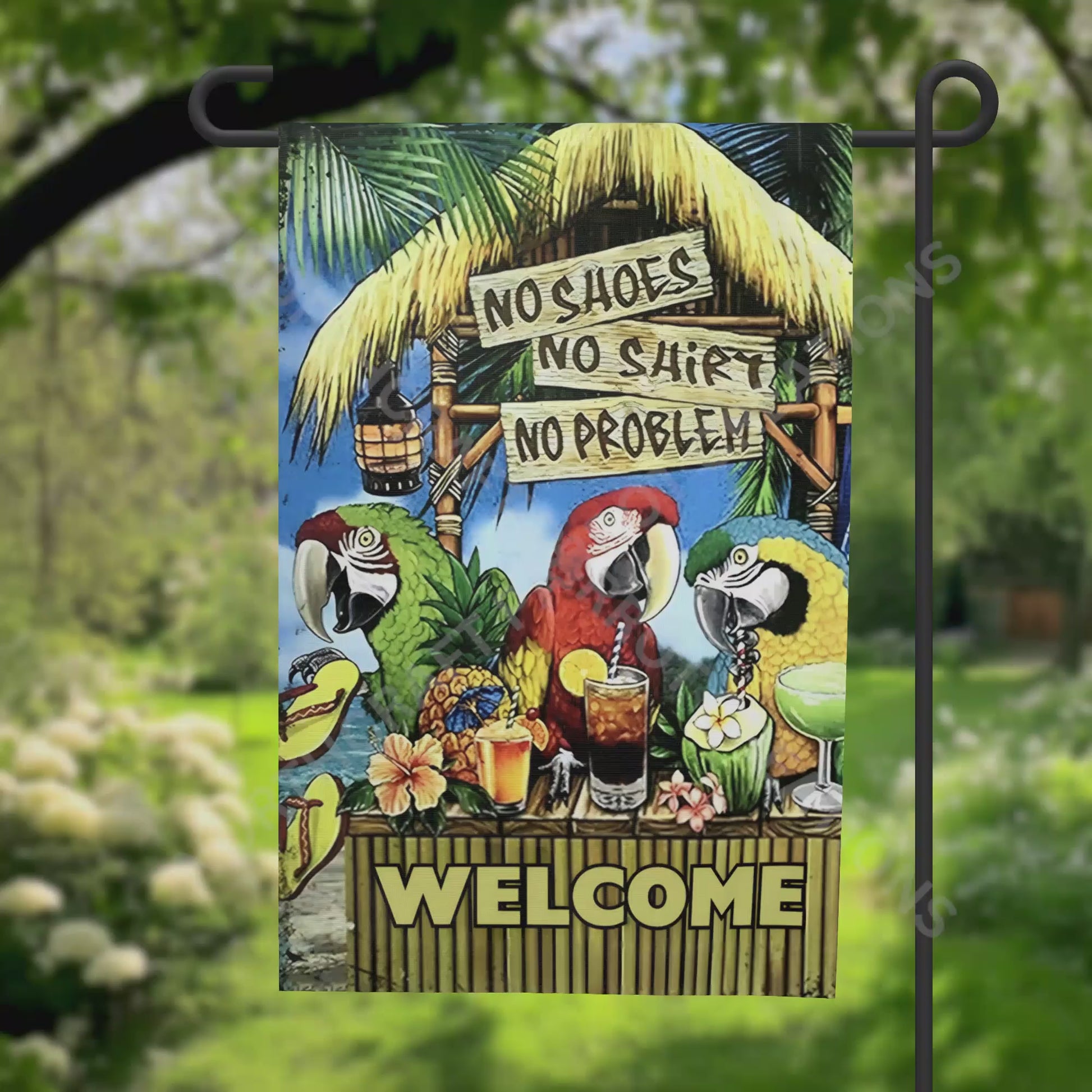 Macaw Trio Tiki Bar "No Shoes No Shirt No Problem, Welcome" Garden Flag