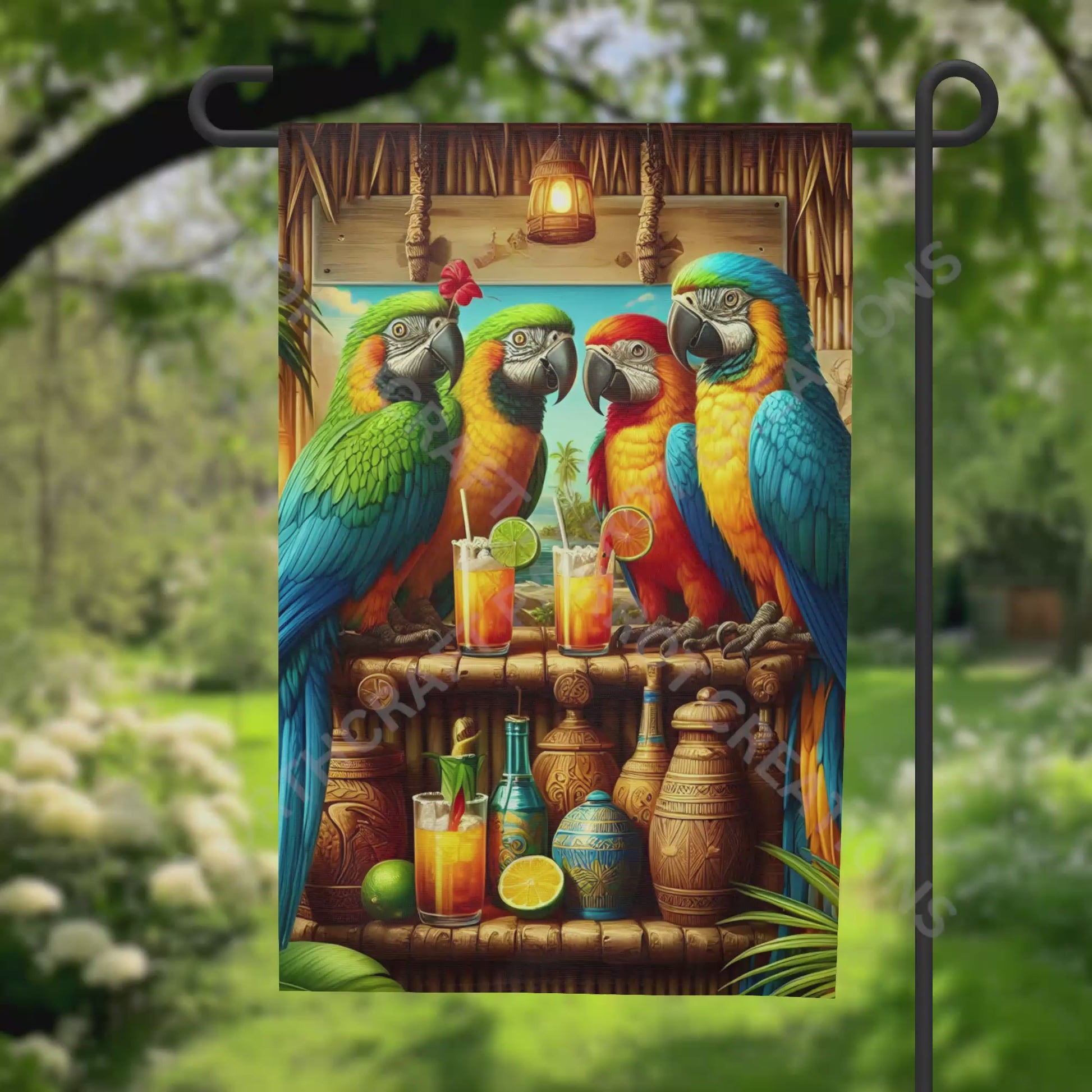 Add a splash of tropical fun to your garden with this vibrant flag featuring four colorful macaws enjoying drinks at a tiki bar. Perfect for bird lovers and outdoor entertainers, it brings playful charm and bright colors to your yard, creating a cheerful atmosphere all season long. Image is on both sides. Flag stand is not included.