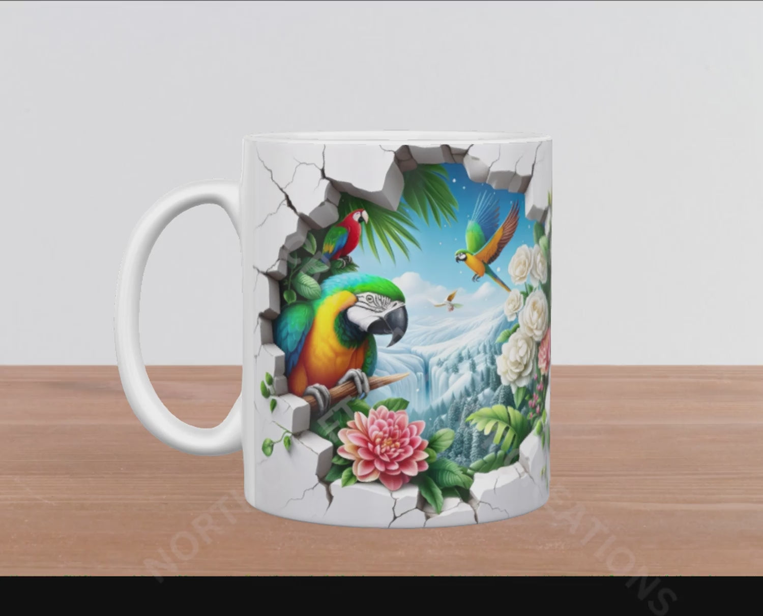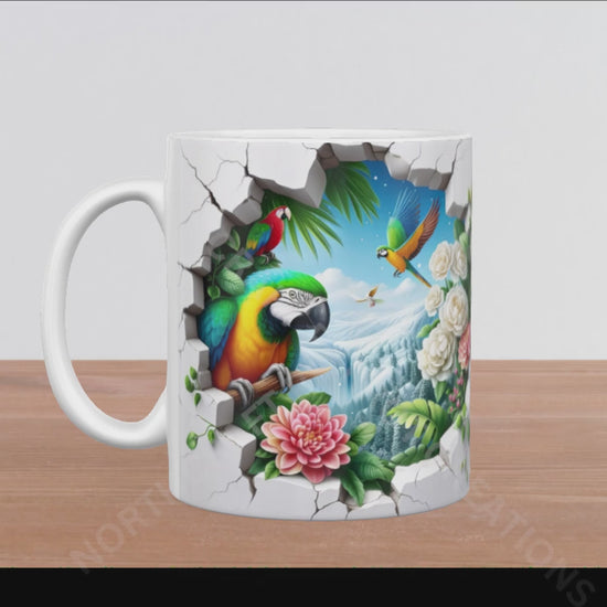 This elegant 15oz ceramic mug features a captivating mountain scene viewed through a hole in the wall, showcasing a Scarlet Macaw alongside two Blue and Gold Macaws surrounded by delicate flowers. Its refined design blends natural beauty with artistic detail, making it a distinguished addition to any collection.