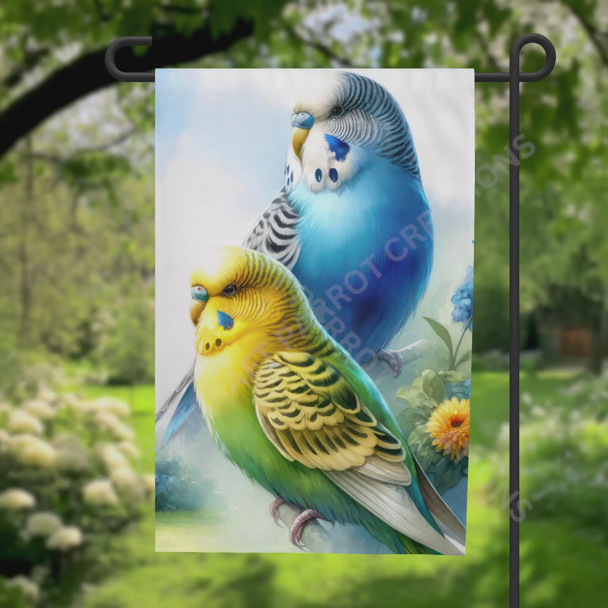 A garden flag featuring a delicate pair of parakeets, one in striking yellow and green and the other in blue and white. Set against a misty backdrop adorned with subtle floral accents, this flag adds a refined touch of nature’s beauty to your garden or patio. Crafted to enhance any outdoor setting, it brings a serene, sophisticated ambiance that complements both classic and contemporary styles. Image is on both sides. Flag stand is not included.
