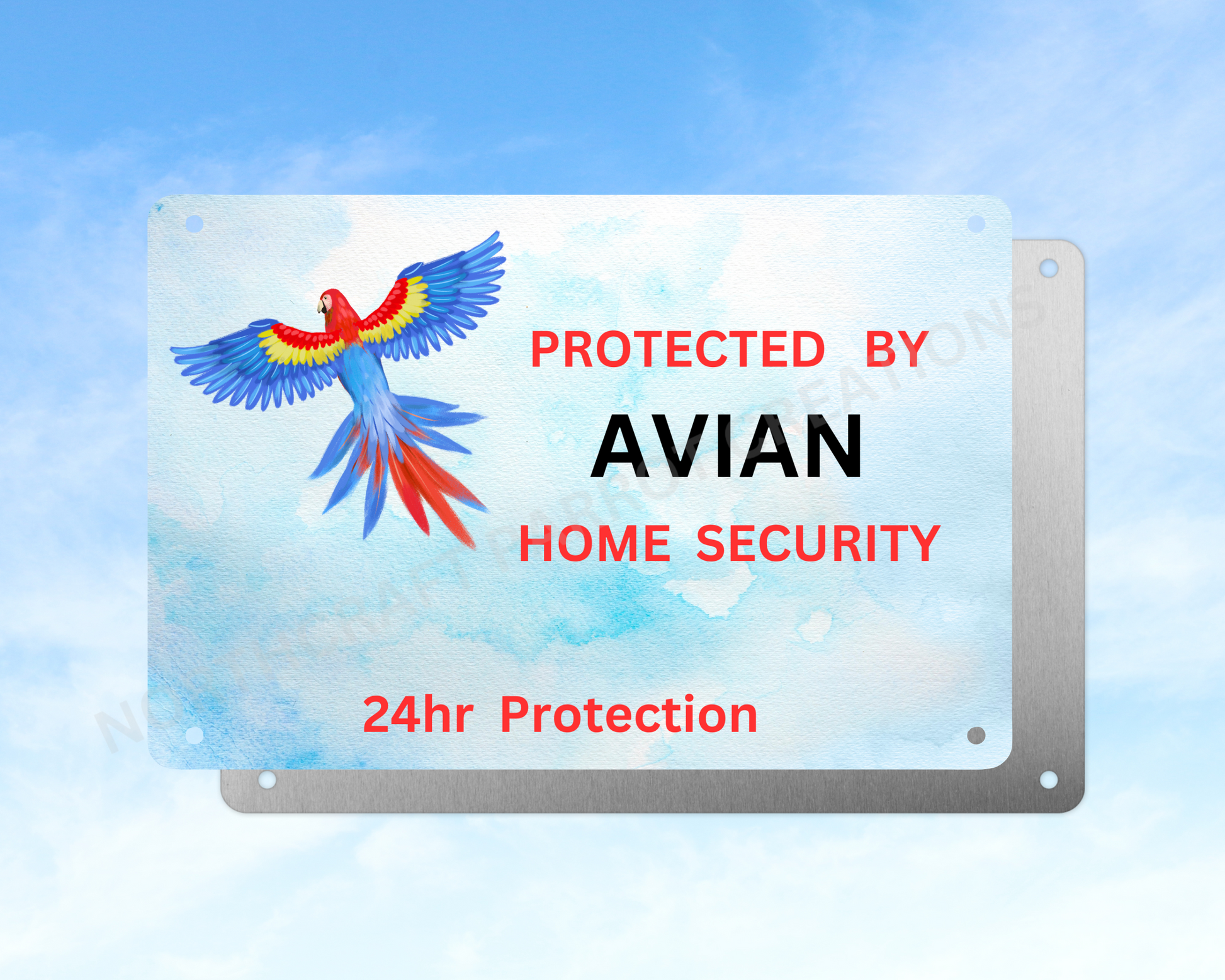 Add a feathered twist to your home security with this approximate 12"x8" aluminum sign declaring "Protected by Avian Home Security 24hr Protection." Durable and weather-resistant, it’s a fun way to warn visitors that vigilant birds are on duty around the clock. Perfect for bird lovers who want to keep their space safe with a playful touch.