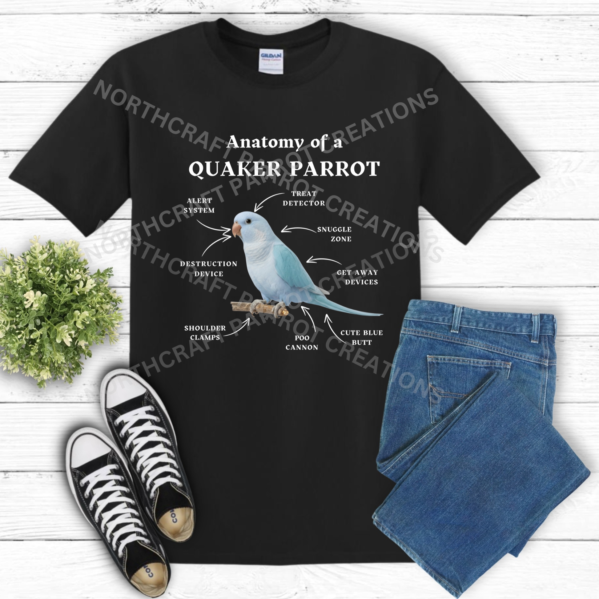 Quaker (Blue) "Anatomy of a Quaker Parrot" Descriptive Labels 100% Cotton Parrot Shirt