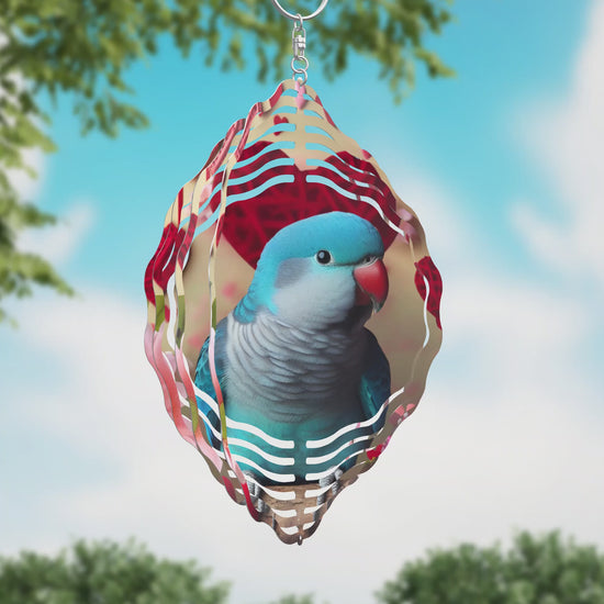 Add a splash of joy to your garden with this playful wind spinner featuring an adorable blue Quaker parrot perched on a branch surrounded by hearts and vibrant flowers. Available in 8" and 10" sizes, it twirls gently in the breeze, bringing a cheerful and charming vibe to any outdoor space. Perfect to delight bird lovers and brighten your patio or yard with a touch of whimsical fun.