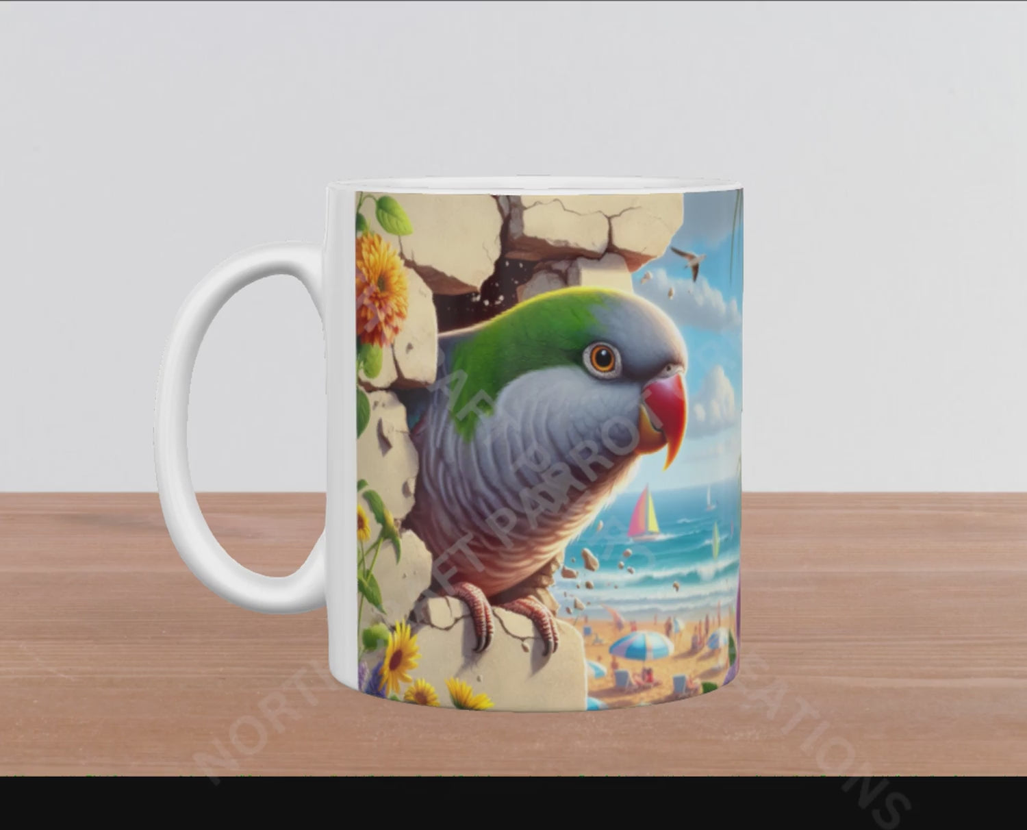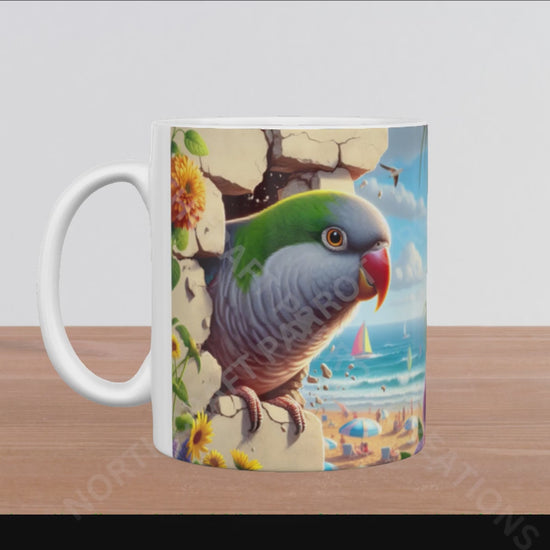 Enjoy your morning coffee with this charming 15oz ceramic mug featuring a lively green Quaker parrot peeking through a wall against a vibrant beach scene adorned with colorful flowers. Its vivid design brings a touch of nature’s cheer to your day, making every sip feel like a relaxing getaway. Durable and comfortable to hold, this mug is perfect for bird lovers seeking a joyful start to their routine.