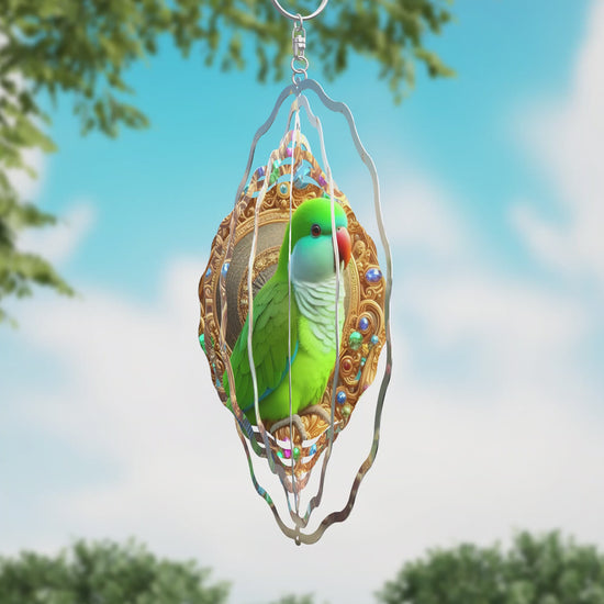 Add a splash of joyful charm to your outdoor decor with this playful wind spinner featuring a bright green Quaker parrot perched proudly on a throne sparkling with jewels. Available in 8" or 10" sizes, it twirls gracefully in the breeze, bringing personality and a hint of royal flair to your garden or patio.