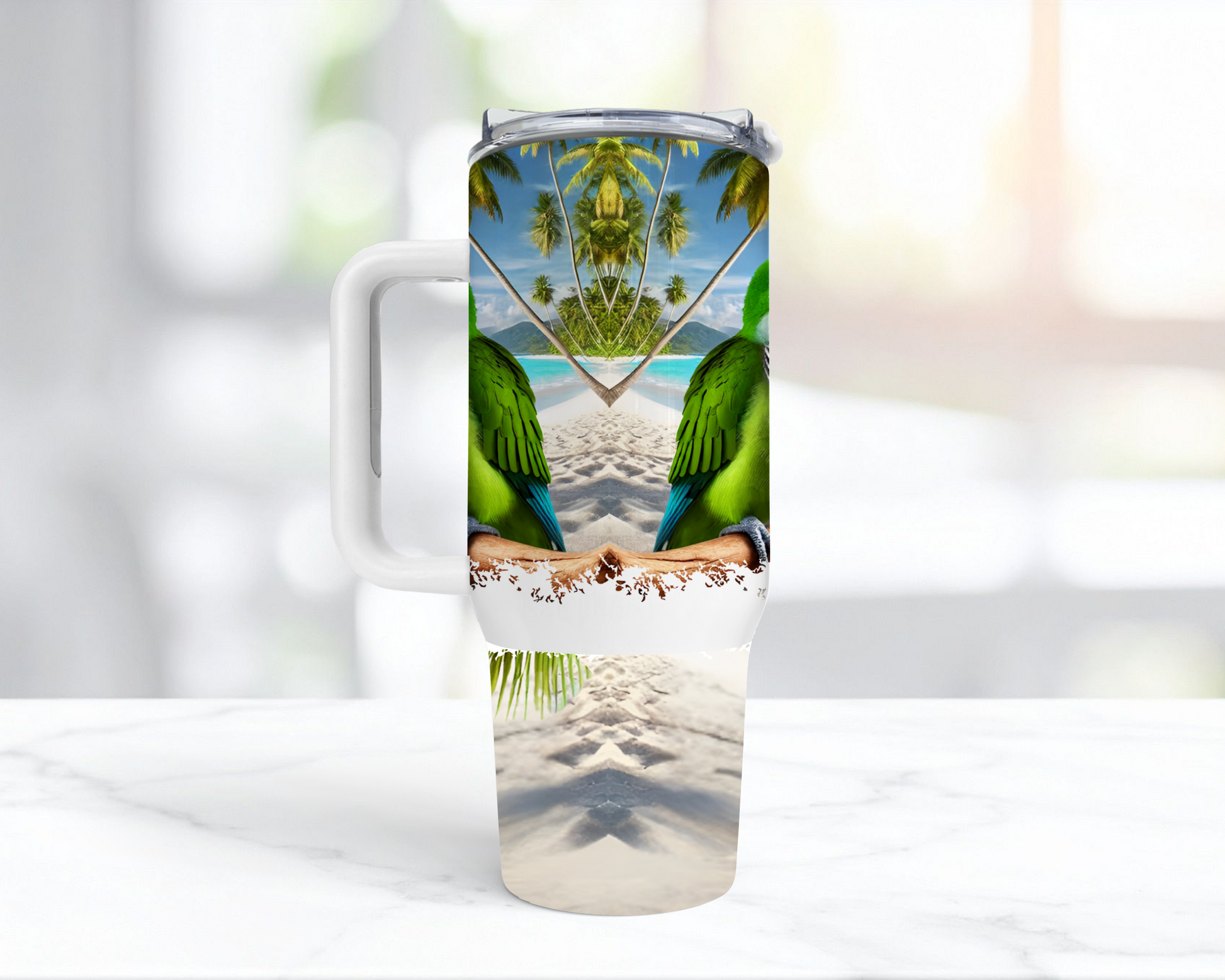 Bring a splash of tropical fun to your drinkware with this 40oz insulated stainless steel tumbler featuring a vibrant green Quaker parrot perched on a branch against a sunny beach and blue water backdrop. Perfect for keeping your beverages icy cold or piping hot, it’s your playful companion for beach days, outdoor adventures, or simply brightening your everyday routine.