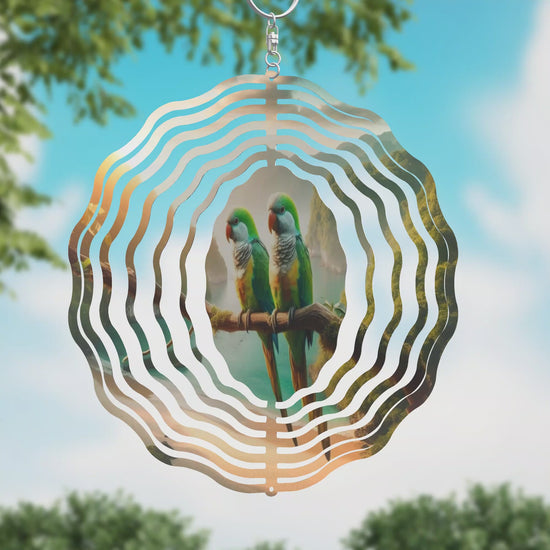 Command attention with this Quaker wind spinner. Featuring two striking Quaker parrots perched boldly before a serene water inlet and rugged mountain backdrop, this 8" or 10" spinner spins with fearless energy. Perfect for adding an adventurous edge and vivid motion to your outdoor space.