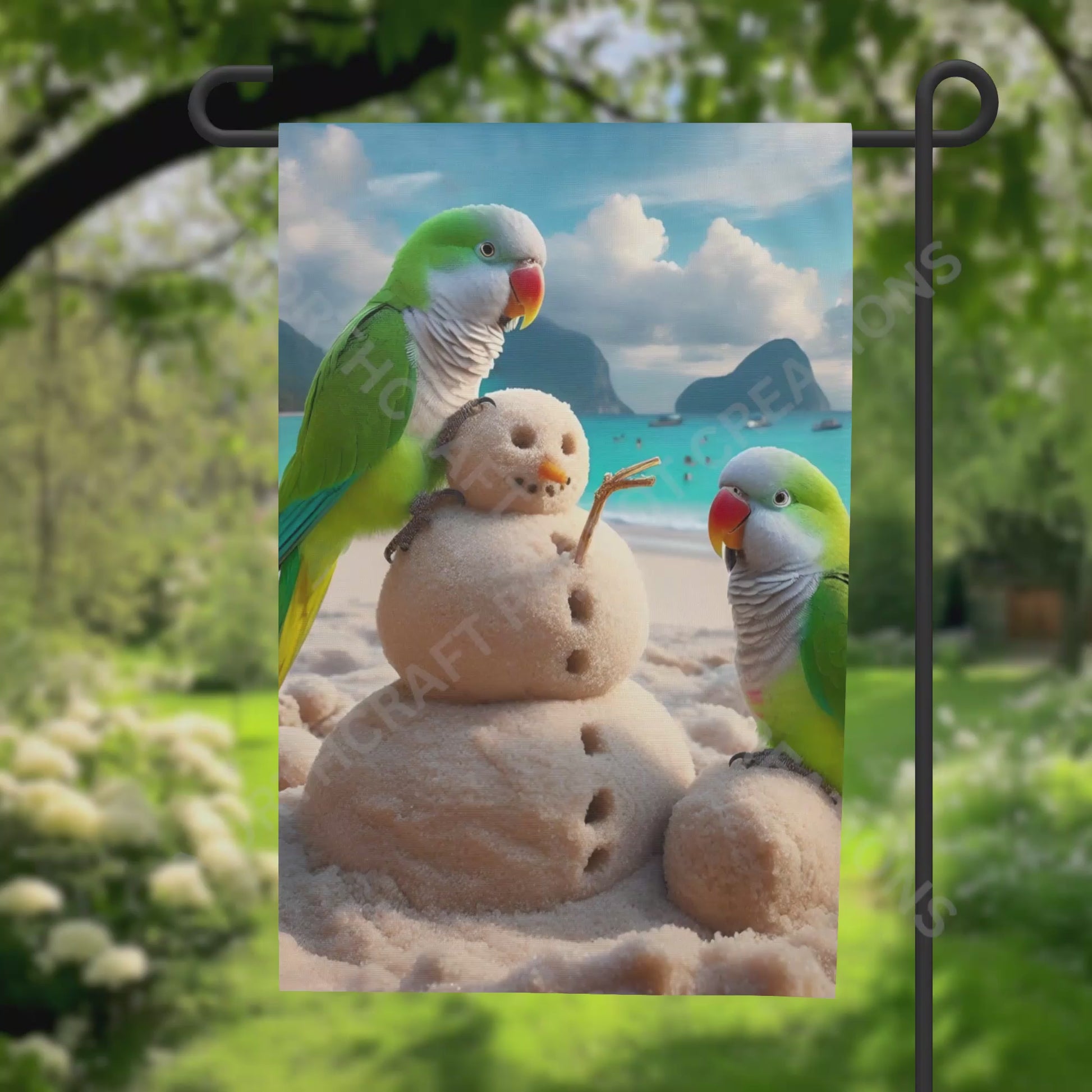Bring a splash of seaside fun to your garden with this playful garden flag featuring a pair of green Quaker parrots building a sandman on the beach. Perfect for adding charm and whimsy to outdoor spaces, it captures a sunny day full of birdy mischief and sandy creativity. Durable and vibrant, this flag brightens your garden with a cheerful scene that’s sure to delight visitors and bird lovers alike. Image is on both sides. Flag stand is not included.