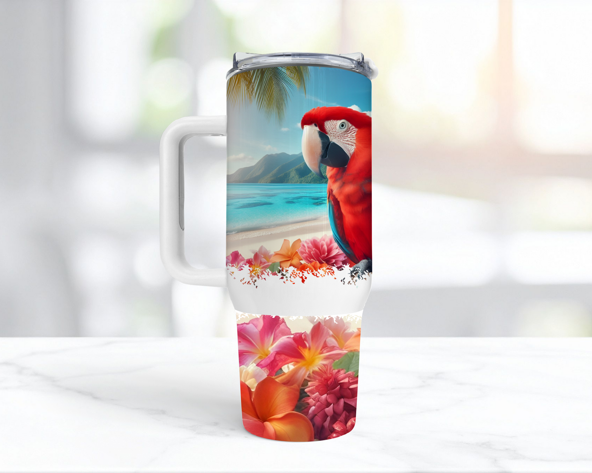 Experience elegance and functionality with this 40oz insulated stainless steel tumbler, featuring a striking Scarlet Macaw perched amidst vibrant tropical flowers against a serene beach backdrop. Its double-wall insulation keeps drinks at the perfect temperature for hours, while the vivid design adds a refined touch to your daily routine or outdoor adventures. Durable and stylish, this tumbler combines artful inspiration with reliable performance.