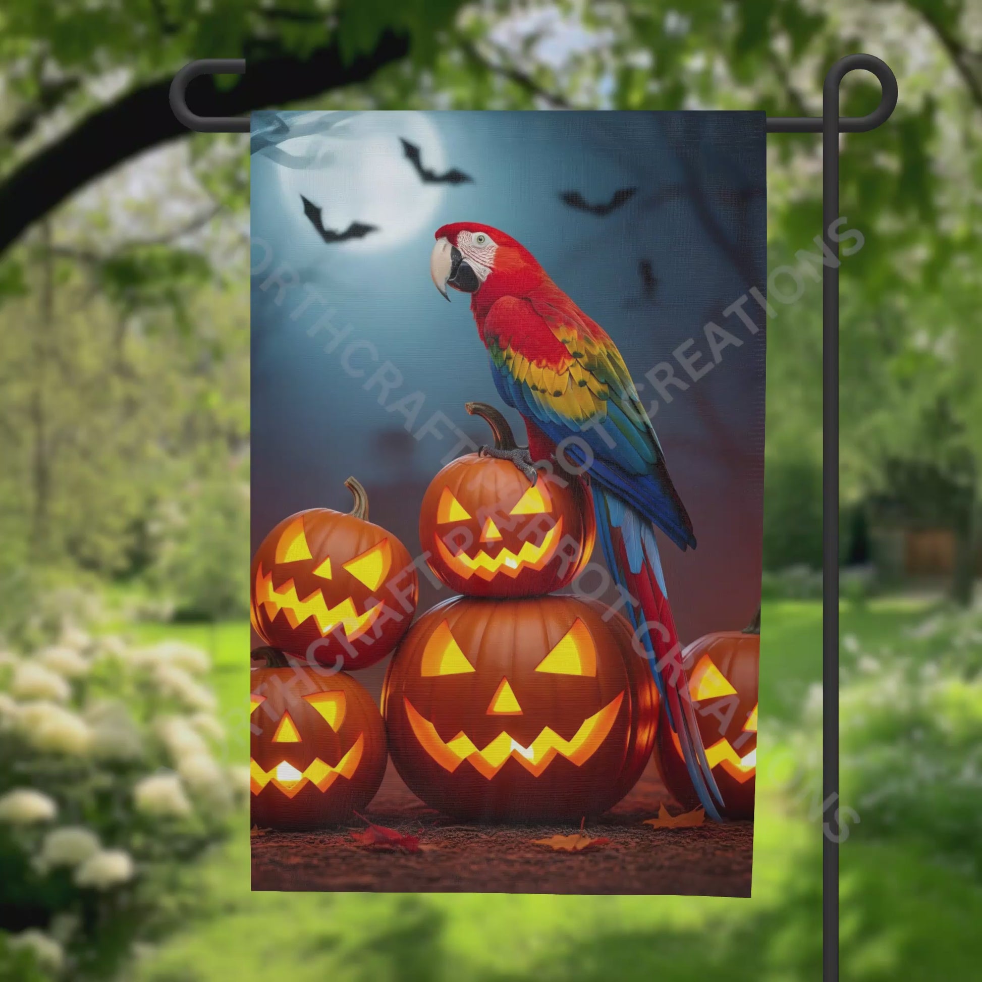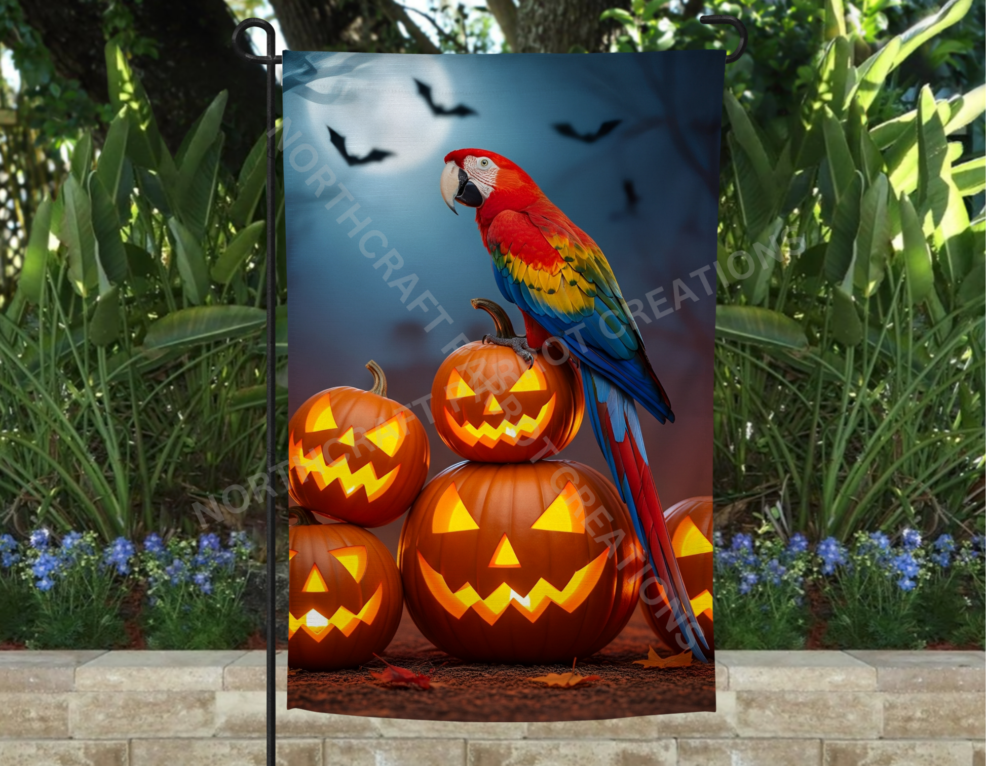 Scarlet Macaw on Pumpkins Halloween Garden Flag