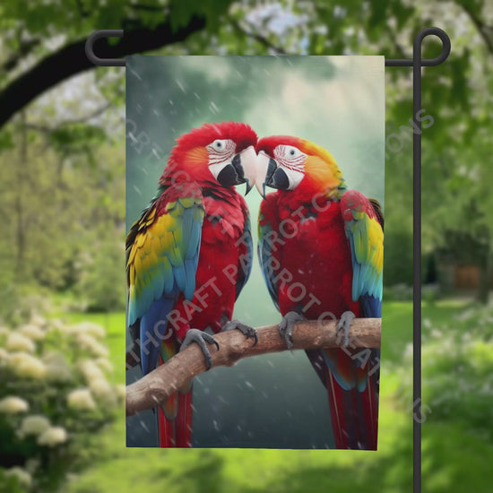 A garden flag featuring a scene of two vibrant Scarlet Macaws resting on a branch amid a gentle, misty rain. This flag adds a touch of exotic elegance to any garden or outdoor space. Its detailed and lifelike design enhances natural surroundings while withstanding outdoor elements, making it both a decorative and durable addition to your garden decor. Image is on both sides. Flag stand is not included.