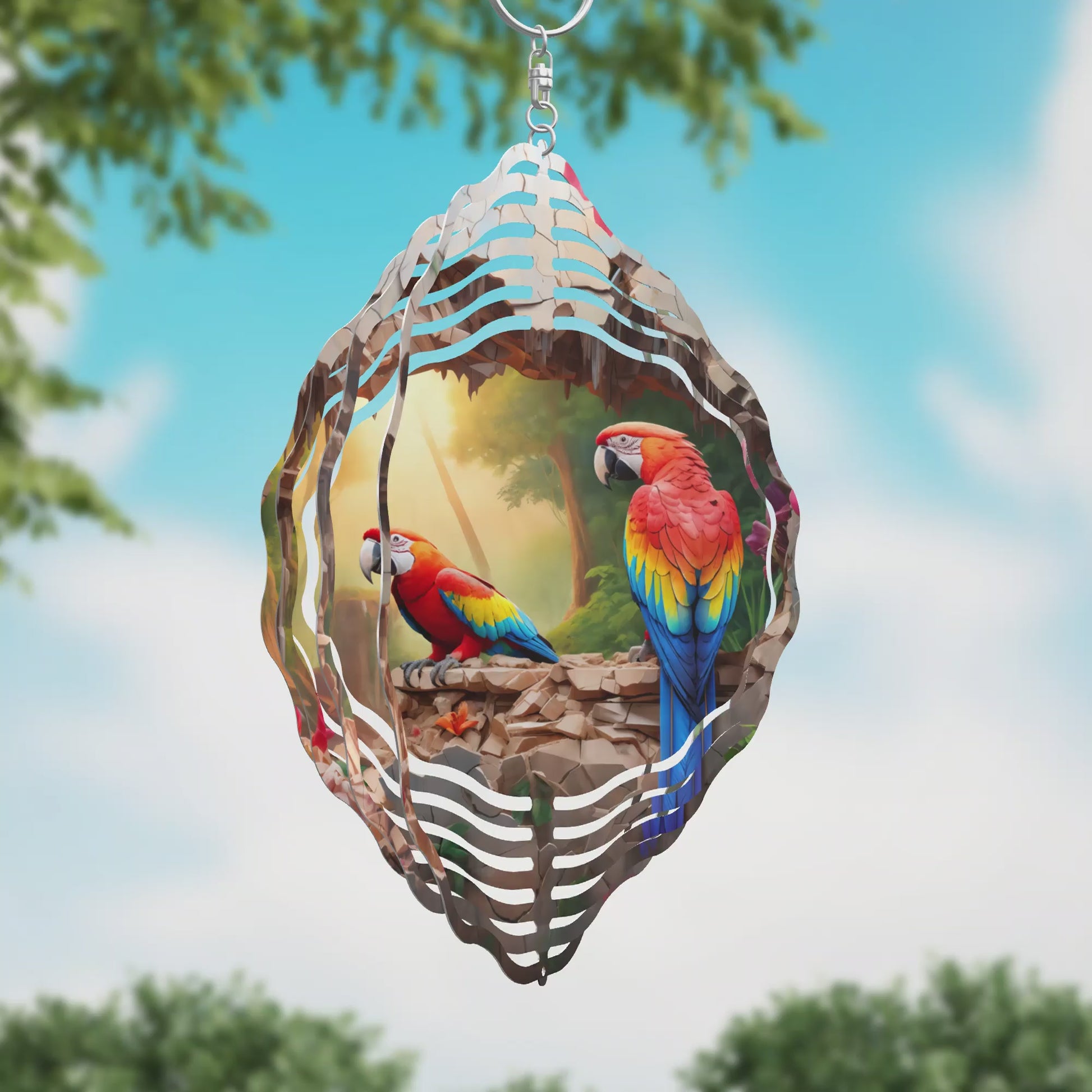 This wind spinner features a vivid pair of Scarlet Macaws perched gracefully on rocks amidst a lush rainforest backdrop. Available in 8" or 10" sizes, it combines artistry and nature-inspired charm to enhance your outdoor space with refined movement and vibrant color. Perfect for adding a sophisticated touch to gardens or patios.