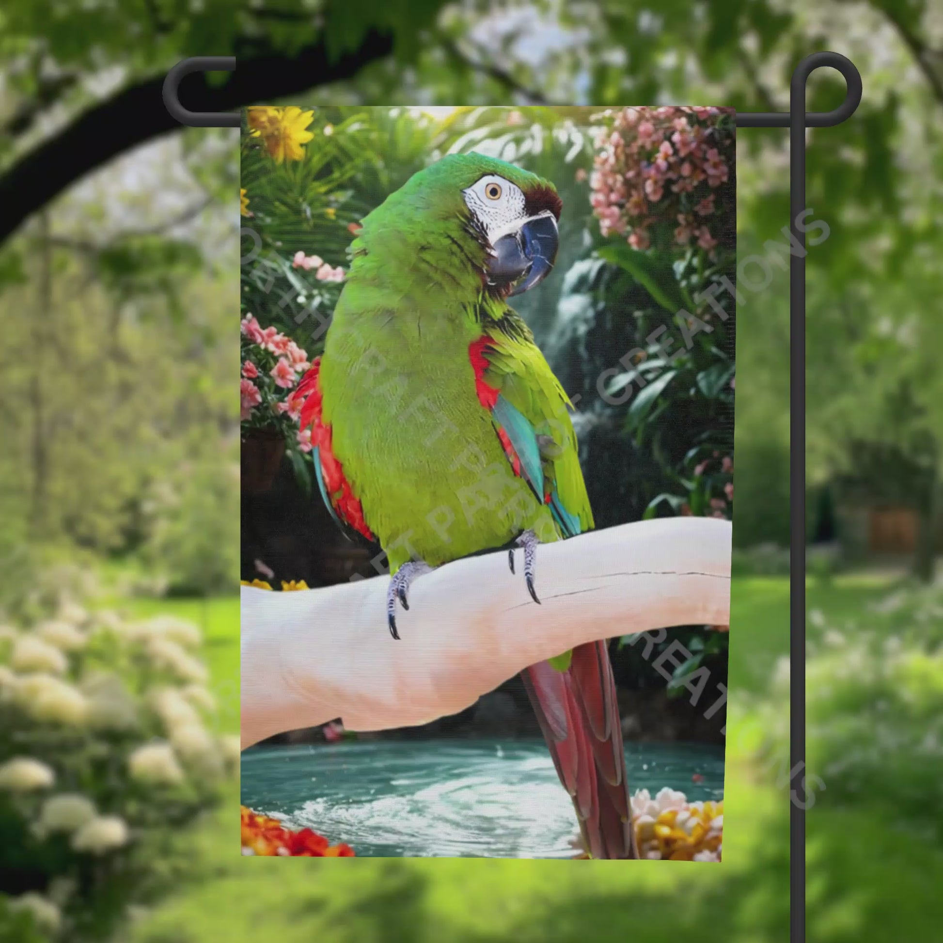Celebrate vibrant wildlife with this Severe Macaw Garden Flag. Featuring a striking macaw perched boldly on a branch against a serene water spring backdrop, it brings color and energy to any outdoor space. This flag adds a daring touch to your garden décor while showcasing nature’s bold beauty. Image is on both sides. Flag stand is not included.