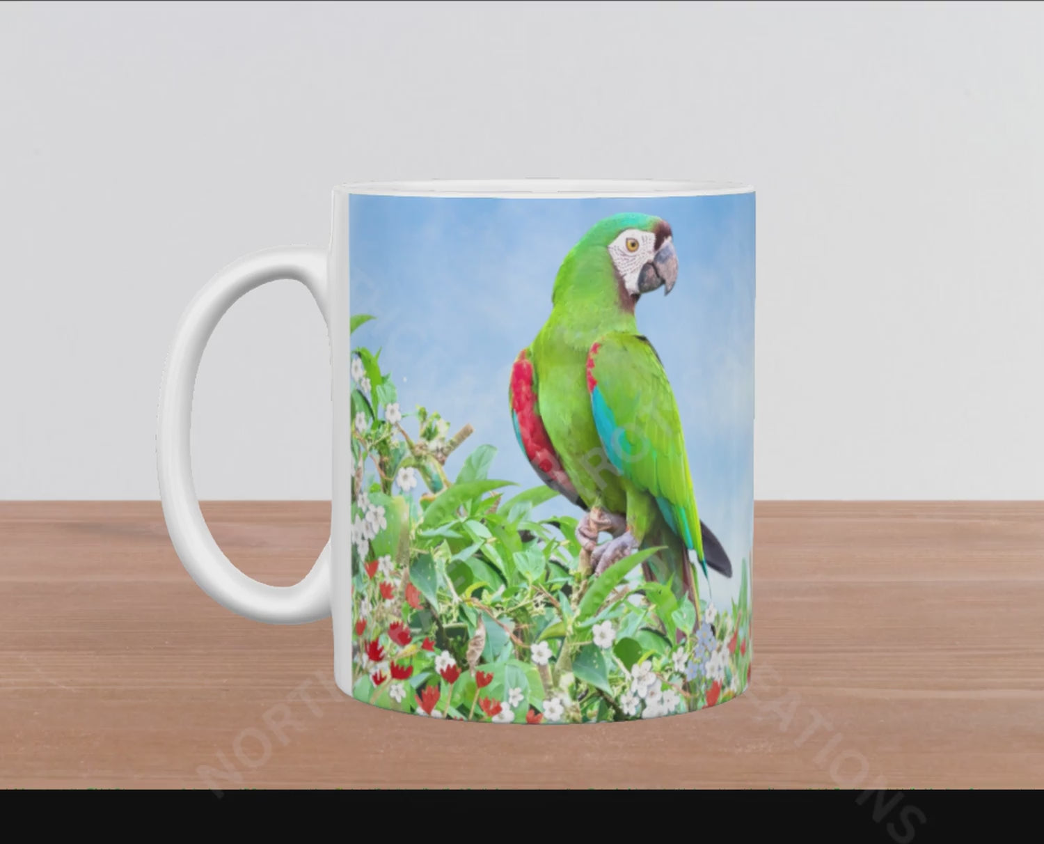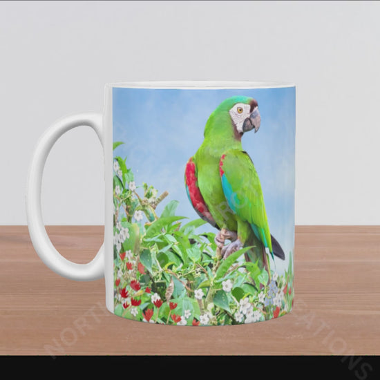 This 15oz ceramic mug features an elegant Severe Macaw perched proudly amidst a vibrant arrangement of colorful flowers and green foliage. Crafted to combine beauty and utility, it offers a generous capacity for your favorite drinks while adding a refined touch of nature-inspired artistry to your everyday moments. Ideal for those who value sophisticated design and quality craftsmanship.
