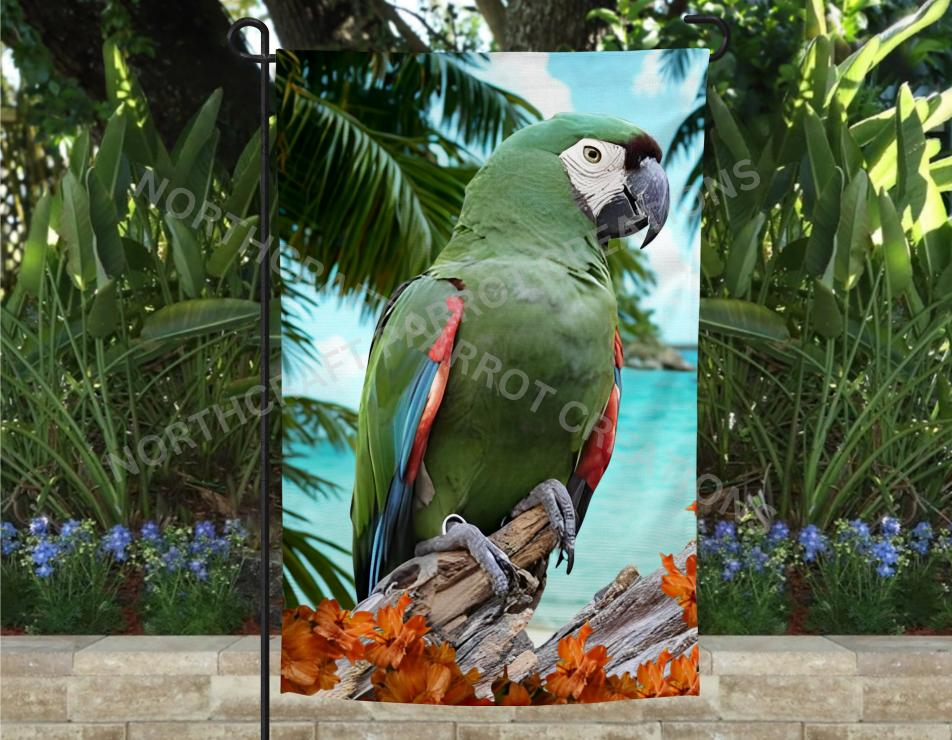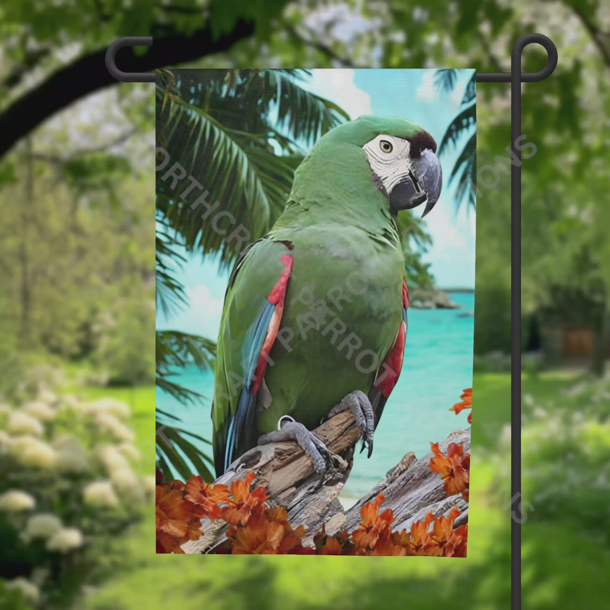 Show off bold tropical flair with this Severe Macaw garden flag, perched proudly among vibrant flowers against a serene beach backdrop. Perfect for adding a daring splash of color and exotic charm to your outdoor space, this flag captures the wild spirit of nature right in your garden. Image is on both sides. Flag stand is not included.