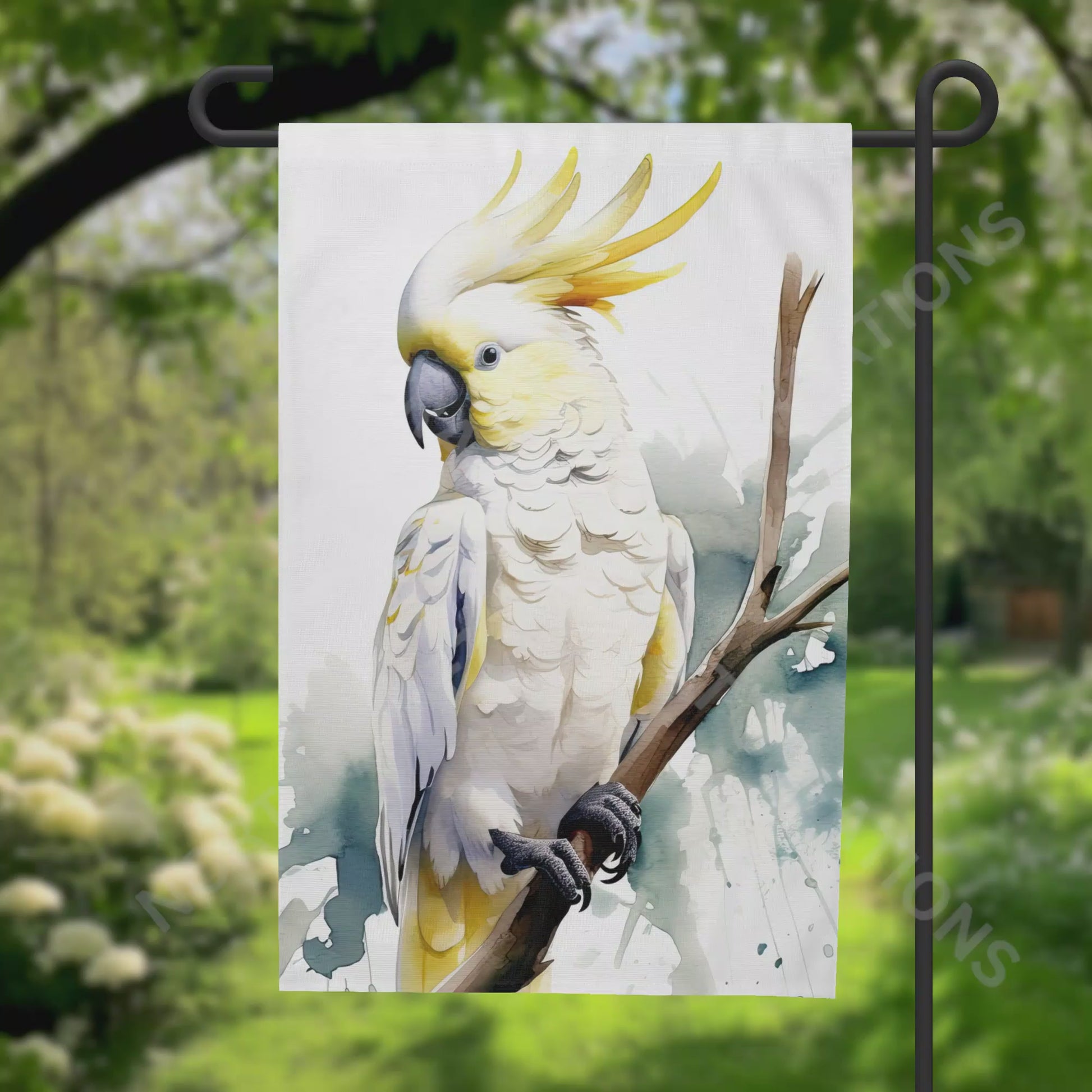 Celebrate bold beauty with this Sulfur Crested Cockatoo garden flag. Featuring a striking cockatoo perched confidently on a branch, it instantly livens up your garden with daring charm. This flag adds a vibrant splash of color and personality to your outdoor space. Perfect for those who want to make a fearless statement in their garden décor. Image is on both sides. Flag stand is not included.