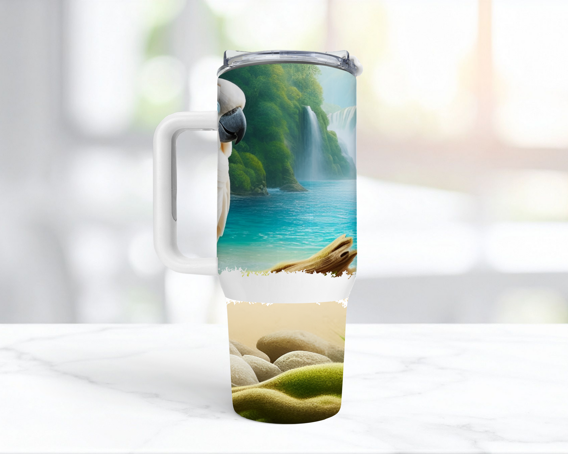 Crafted from premium stainless steel, this 40oz insulated tumbler features an illustration of a Sulfur Crested Cockatoo set against a serene waterfall backdrop. Designed to maintain your beverages at the perfect temperature for hours, it combines durability with artistic detail, making it ideal for both daily use and outdoor adventures. Its generous capacity ensures you stay hydrated while enjoying nature’s beauty.