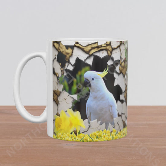This elegant 15oz ceramic mug showcases a stunning white Sulfur Crested Cockatoo with its vibrant yellow crest, beautifully surrounded by daffodils that highlight the bird’s striking colors. A classic pillar runs down the center, adding a refined architectural touch to this graceful design, perfect for adding sophistication to your daily routine.