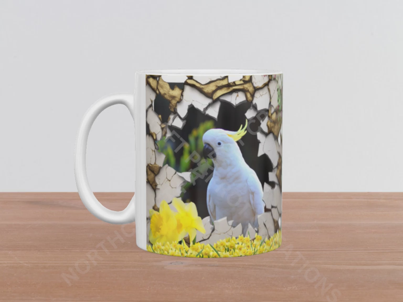 This 15oz ceramic mug showcases an expert illustration of a Sulfur Crested Cockatoo viewed through a broken stone wall, framed elegantly by vibrant daffodils and a classic pillar at the center. Its detailed design captures the striking contrast between nature and architecture, making it a refined choice for bird enthusiasts and art lovers alike. Durable and generously sized, this mug blends artistic beauty with everyday functionality.