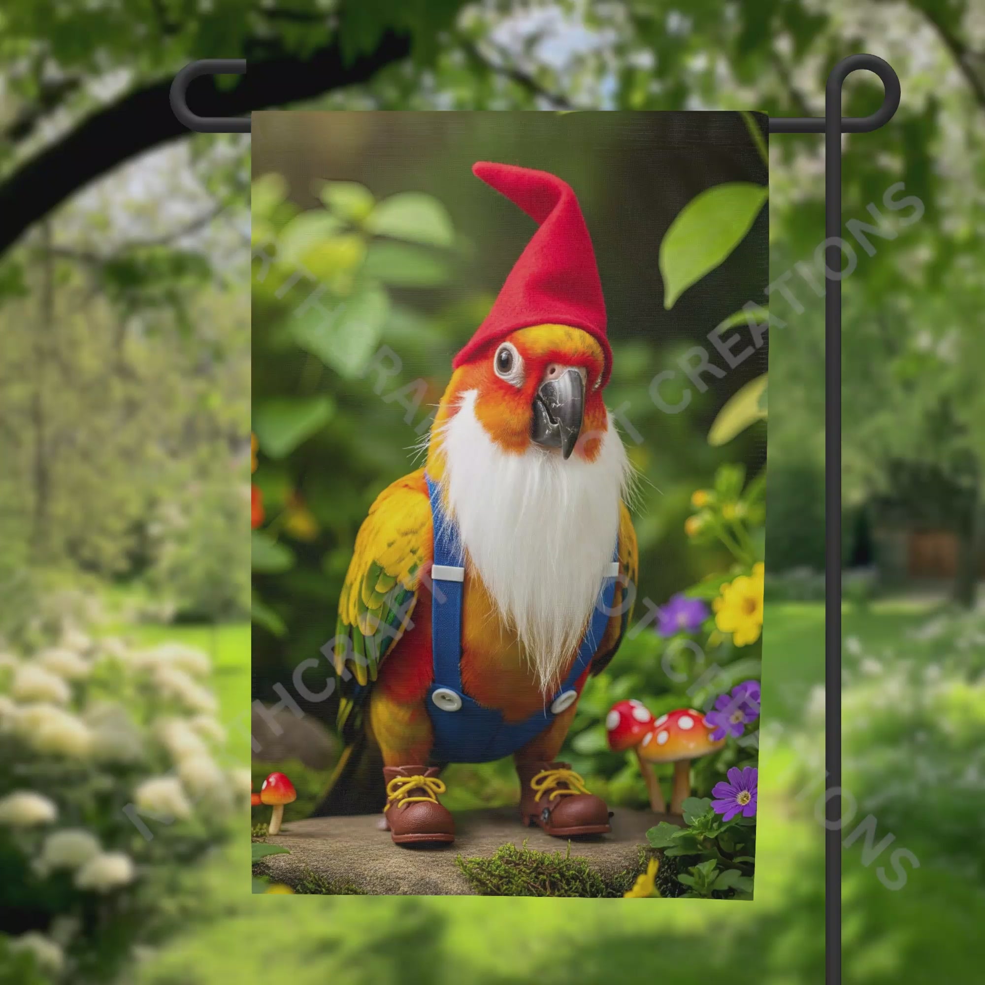 Bring charm and cheer to your garden with this playful Sun Conure garden flag! The adorable bird is dressed as a garden gnome, complete with blue suspenders, a bright red hat, and a fluffy white beard, adding a fun and whimsical touch to your outdoor décor. Perfect for adding personality and a smile to your yard all year round.