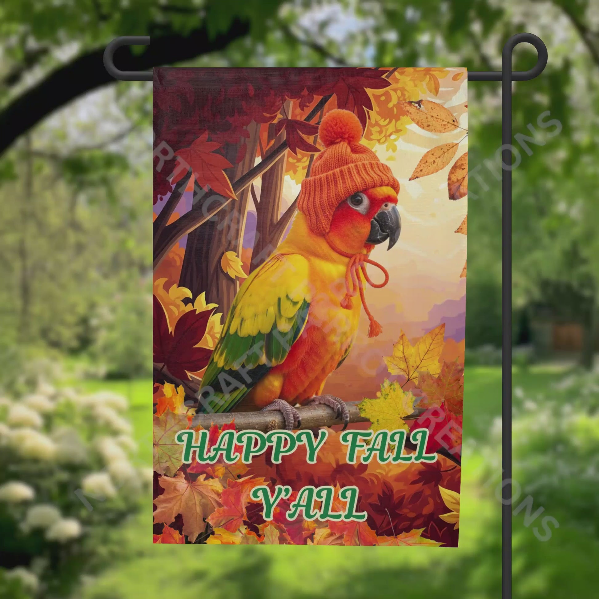 Celebrate the cozy charm of autumn with this 12"x18" garden flag featuring a cheerful Sun Conure wearing a cute hat amidst colorful fall leaves. Brighten your outdoor space and welcome the season with the playful greeting "Happy Fall Y'all," adding a touch of fun and warmth to your garden or porch.