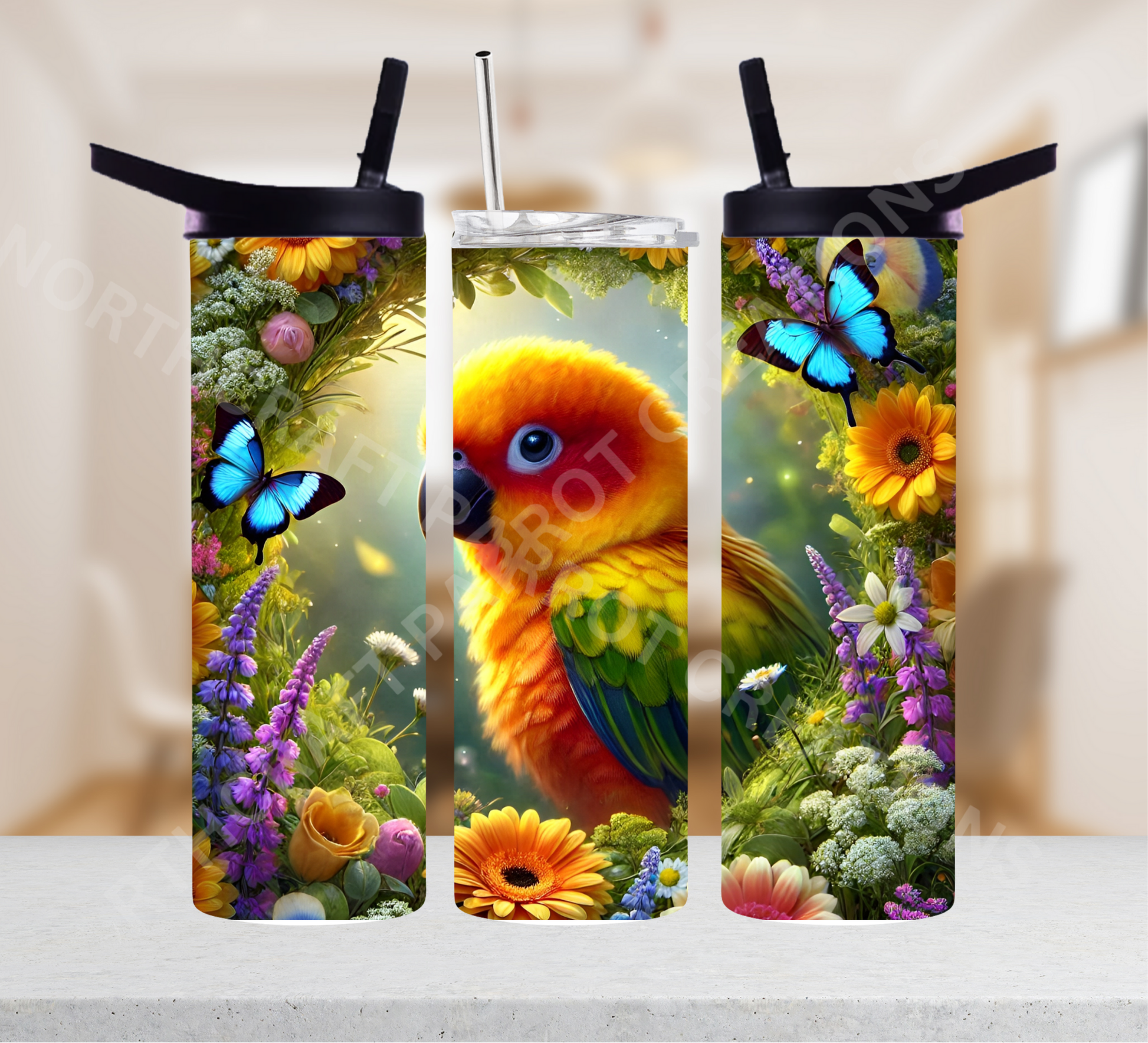 Celebrate the lively charm of the Sun Conure with this stunning 20oz or 30oz tumbler. Featuring a vibrant Sun Conure perched gracefully inside a delicate floral circle accompanied by two little blue butterflies, this tumbler blends nature’s beauty with vibrant colors. Perfect for brightening your day or gifting to a bird lover, it keeps drinks at the ideal temperature while showcasing an eye-catching design that’s both elegant and joyful.