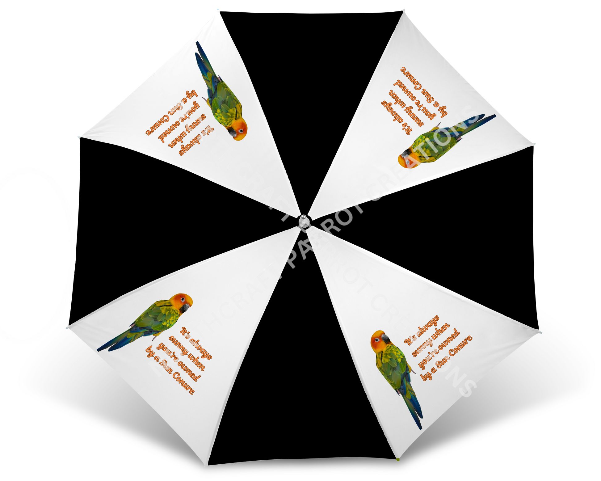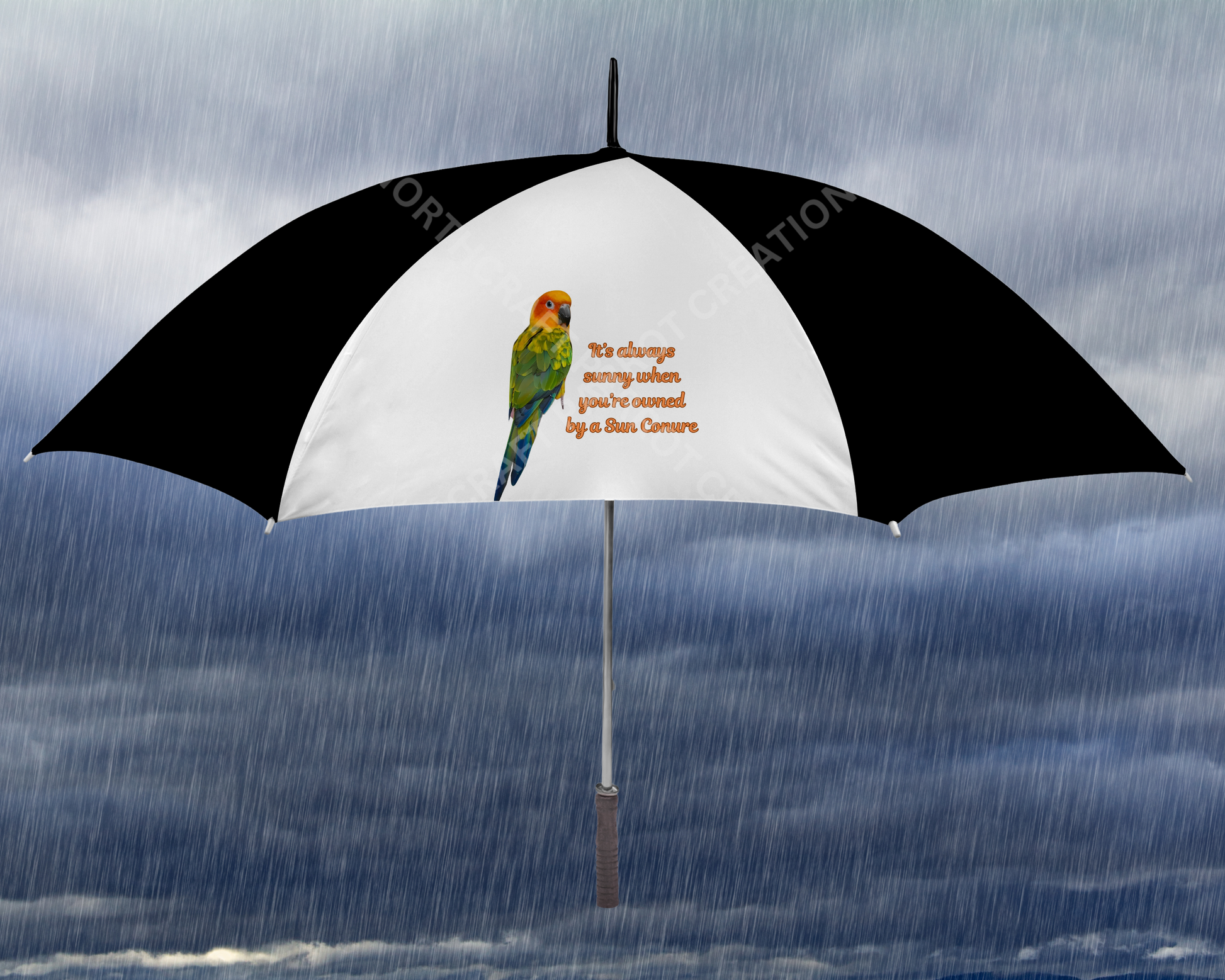 This large umbrella features a vibrant Sun Conure design paired with the charming phrase, "It's Always Sunny When You're Owned by a Sun Conure." Crafted to provide ample coverage, it combines practical protection from the elements with a touch of personality. Ideal for bird lovers who appreciate both function and style, this umbrella offers a refined way to brighten any rainy day.