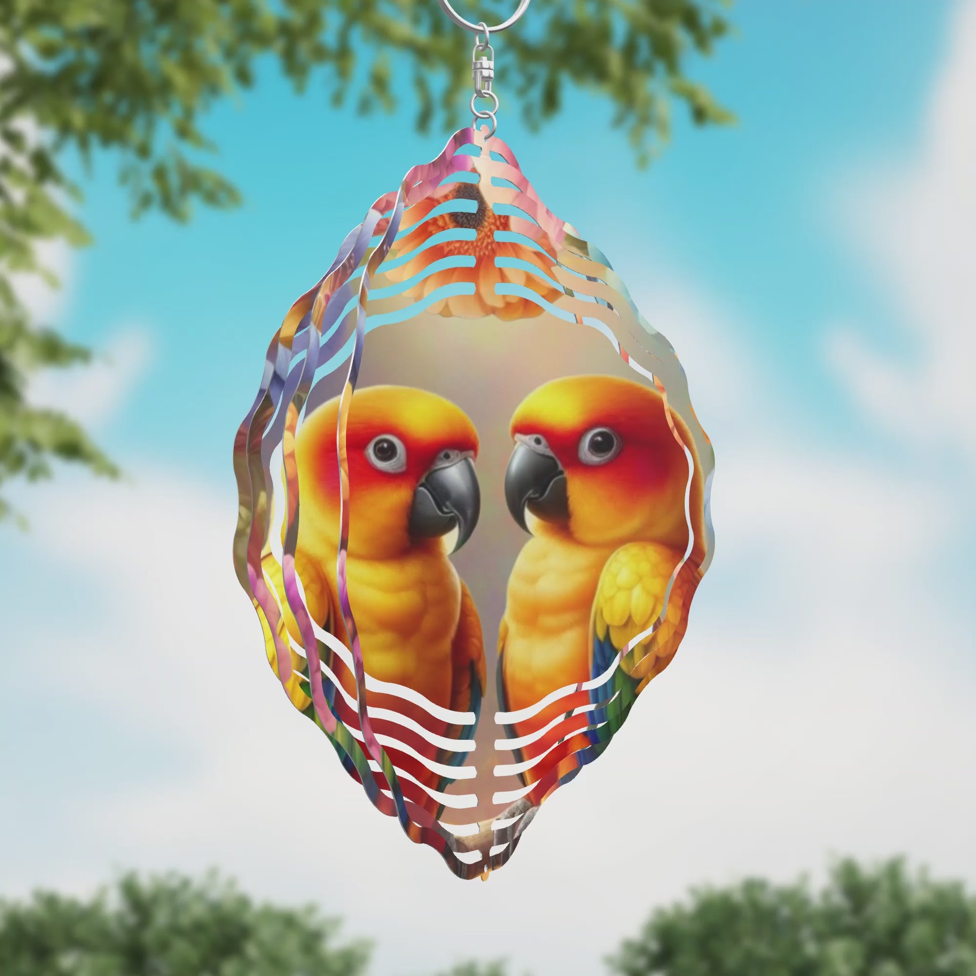 This cheerful wind spinner features a vibrant pair of Sun Conures facing each other, beautifully framed by colorful flowers. Available in 8" or 10" sizes, it adds a lively touch to any outdoor space, bringing warmth and charm with every gentle spin. Perfect for brightening your garden or patio décor with a splash of tropical color and joyful energy.