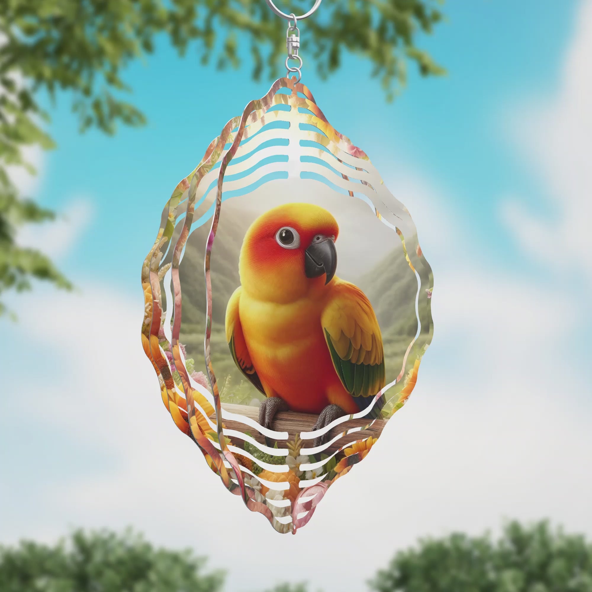 The Sun Conure wind spinner, available in 8" and 10" sizes, showcases a beautifully perched Sun Conure framed by vibrant sunflowers and soft pink blooms. Crafted with attention to detail, this elegant spinner brings graceful movement and a refined splash of color to any outdoor setting, enhancing your garden or patio with a touch of sophisticated natural beauty.