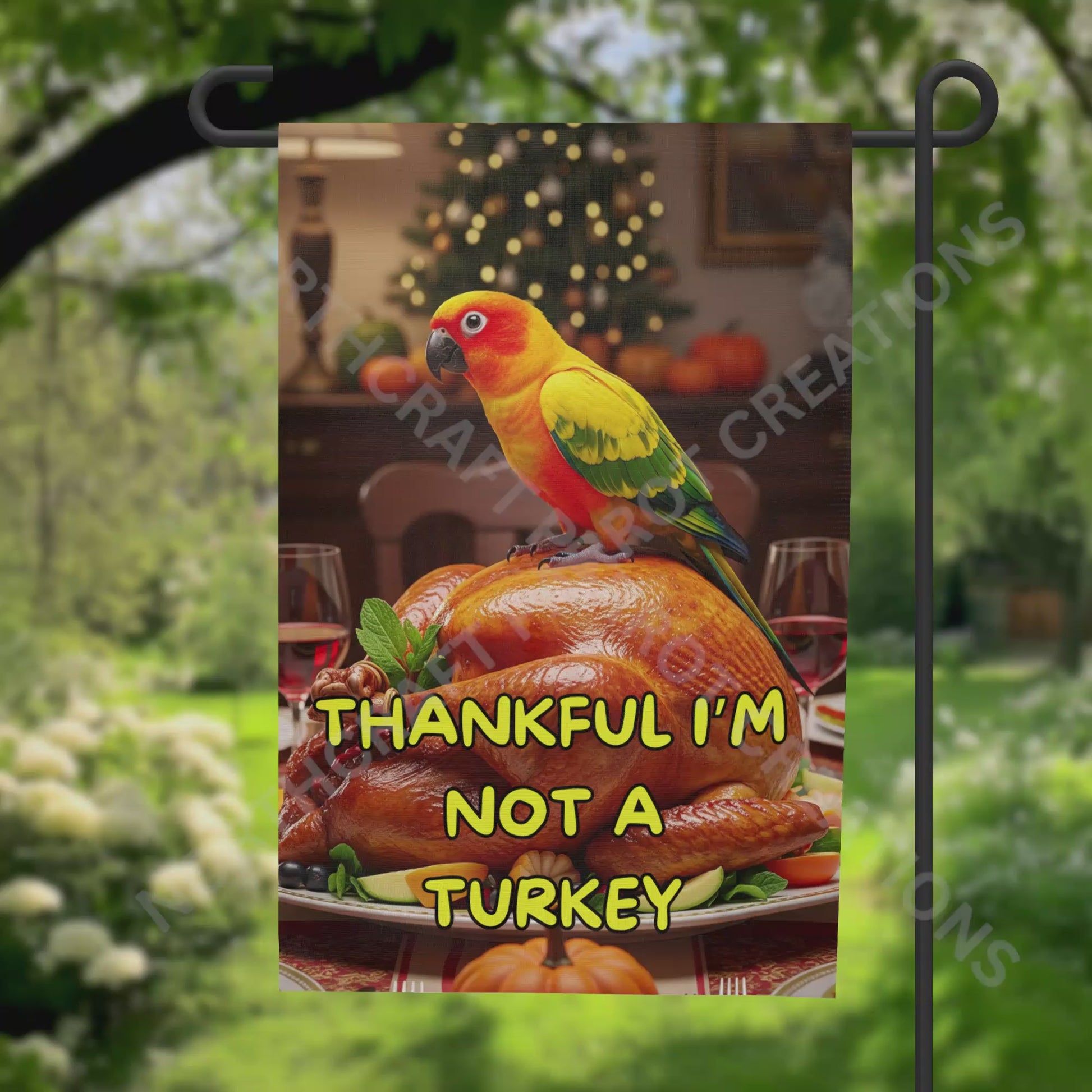 Celebrate Thanksgiving with a playful twist using this 12"x18" garden flag featuring a vibrant Sun Conure perched on a cooked turkey alongside the cheeky phrase "Thankful I'm Not a Turkey." Perfect for adding color and humor to your outdoor décor, this flag brings a lighthearted charm that will delight guests and passersby alike. Durable and eye-catching, it’s an irresistible way to showcase your festive spirit with a smile.