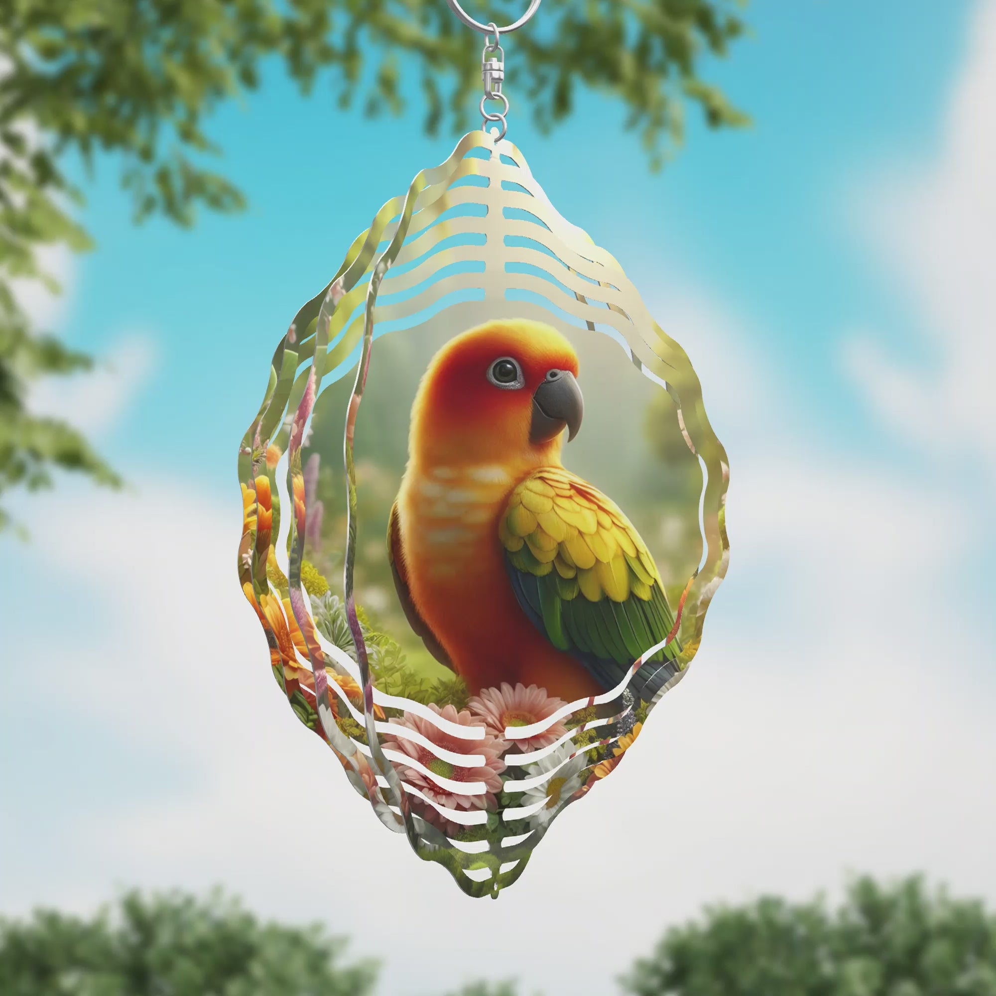 Capture the gentle warmth of a sunny day with this elegant 8" or 10" wind spinner, featuring a vibrant Sun Conure perched among delicate white and pink daisies. Soft sunlight filters through, creating a tender glow that brings a romantic touch to any outdoor space. Let the subtle movement and radiant colors inspire peaceful moments and add charm to your garden or patio.
