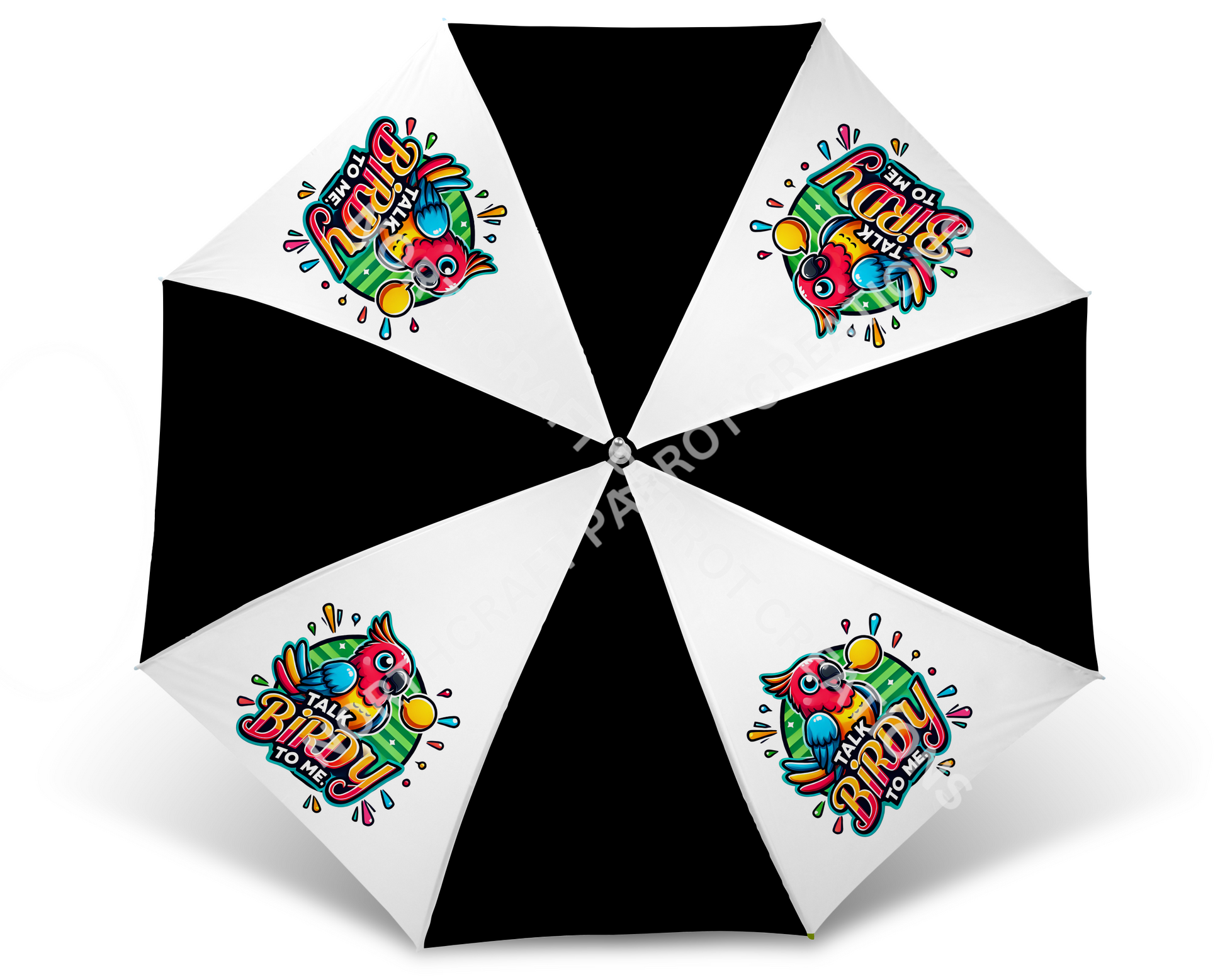 Brighten up any rainy day with the "Talk Birdy to Me" umbrella! Featuring a charming cartoon parrot and playful text, this large umbrella is perfect for parrot lovers who want to add a splash of fun to their weather gear. Stay dry and show off your feathered friend flair wherever you go.