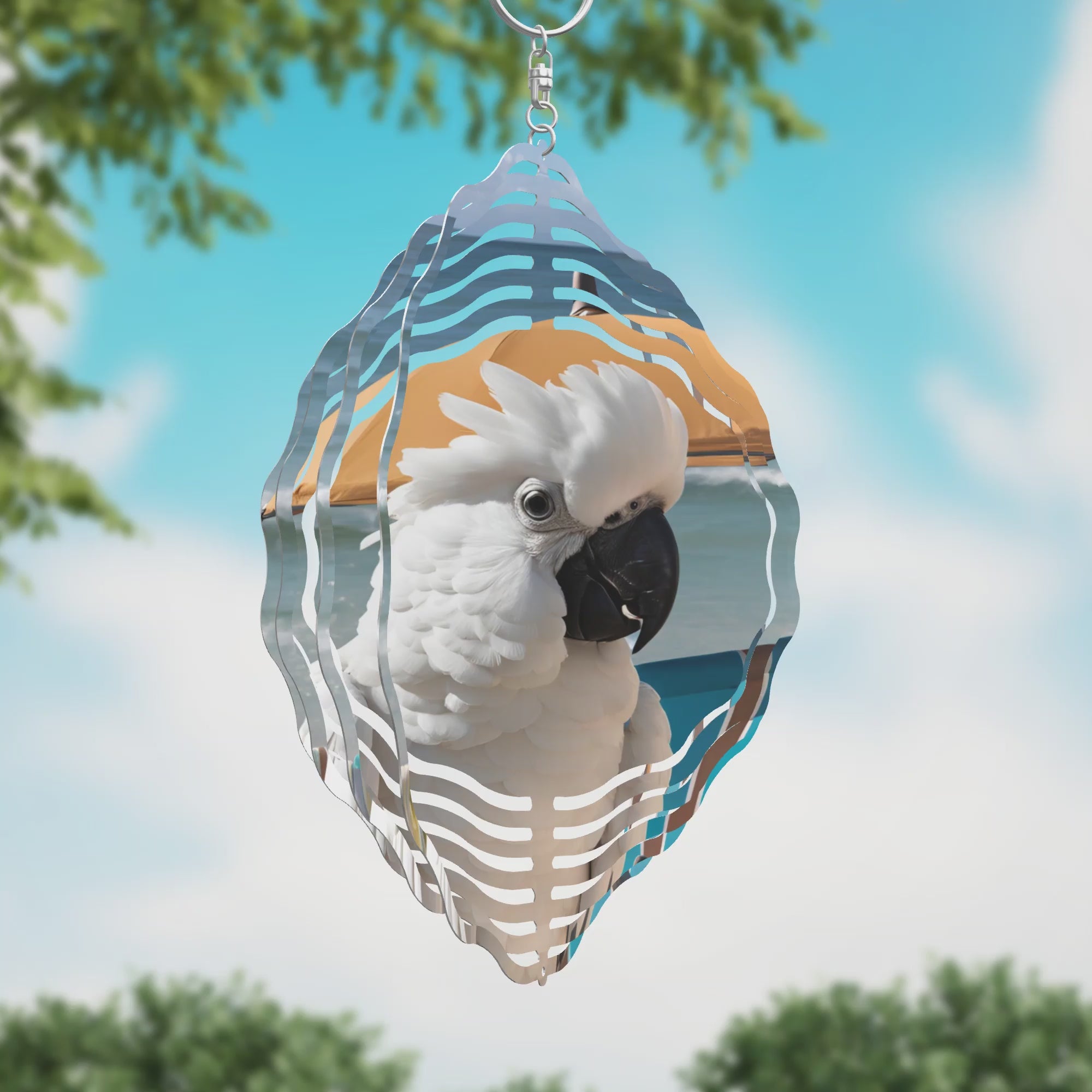 Bring coastal charm to your space with the Umbrella Cockatoo Wind Spinner. Featuring a joyful cockatoo with its beautiful white feathers next to a beach umbrella, this 8" or 10" spinner captures the carefree spirit of the shore. Perfect for brightening patios or gardens, its gentle motion adds a breezy, beachy vibe that delights any bird lover.